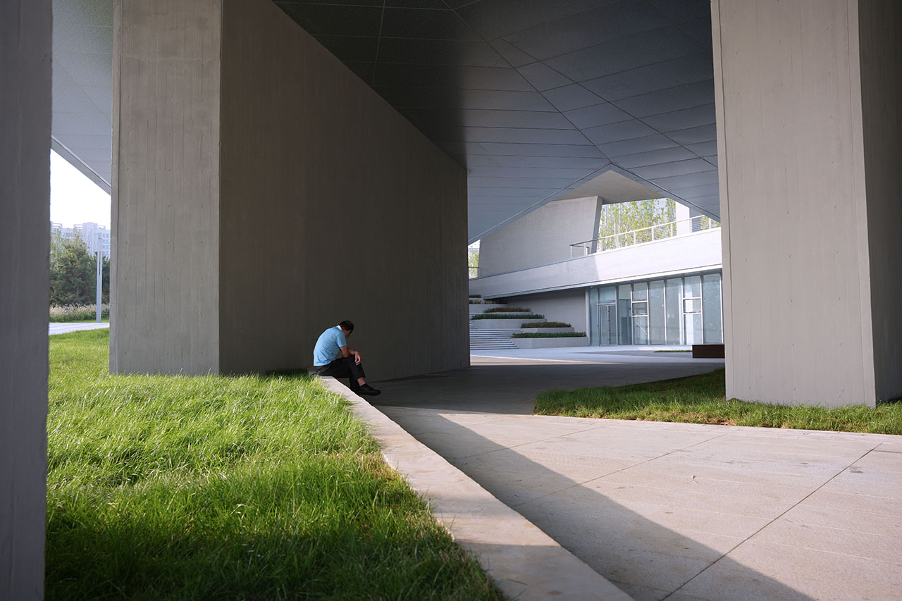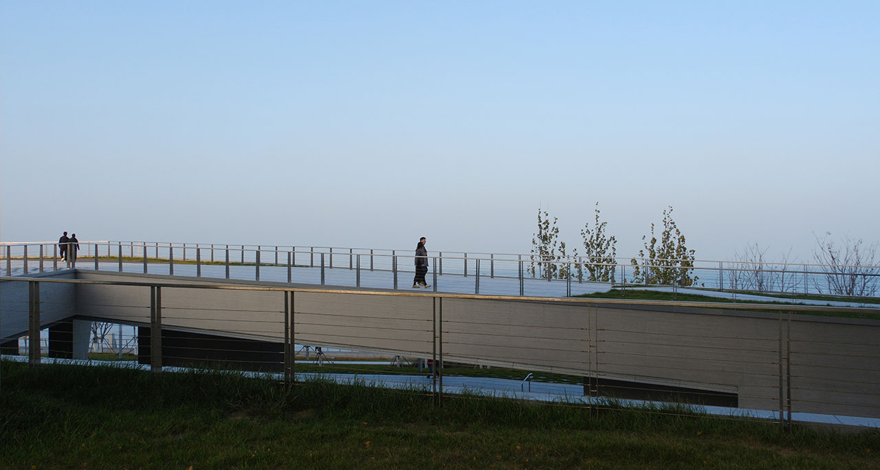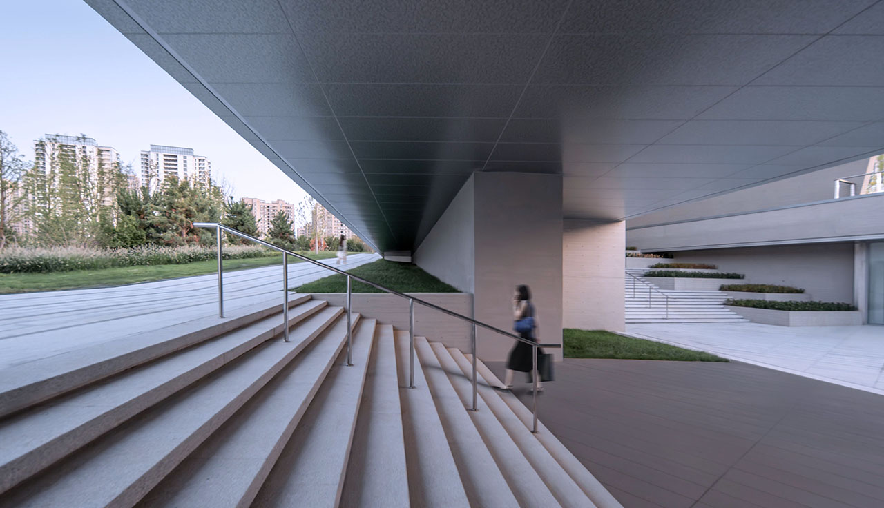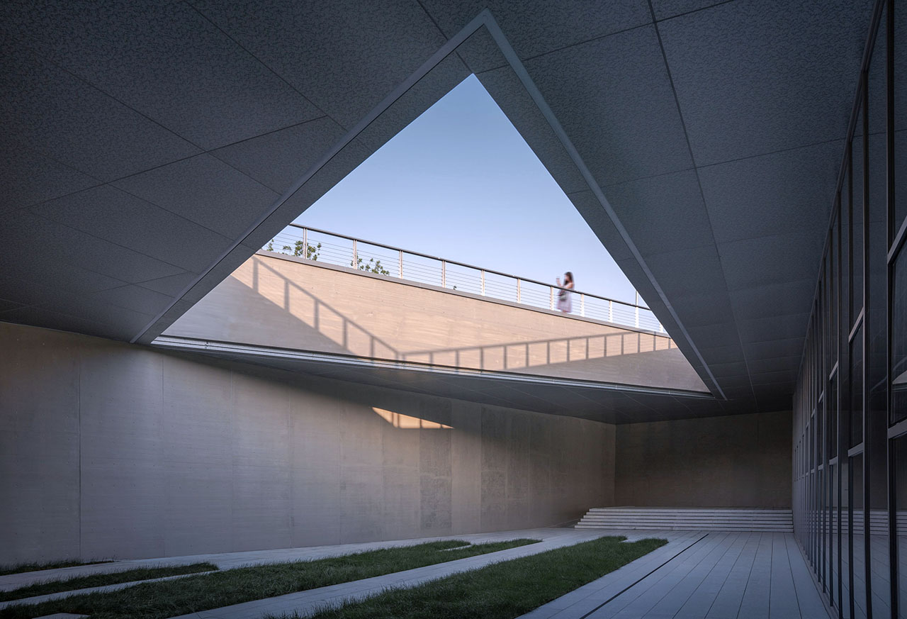 咨询中心的大部分功能“藏”在地下,屋顶与地面相连并覆上绿植,倾斜屋面、下沉庭院与多层标高构架出一套连贯的“折叠”空间系统,也带来极强适应性。抬升的平台成为落日观赏点与集会场所,其下方则形成遮阳休憩长廊。