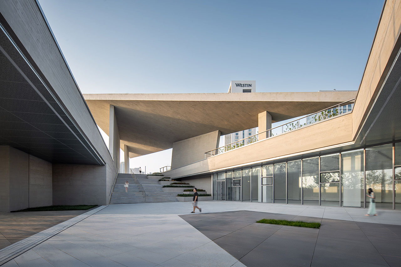 面朝大海,背靠会展中心,在两个巨型尺度的面前,任何形式化的表现都不是最合适的选择。我们将基地的正负零标高处理成一道“地平线”广场,承载着整个会展中心人流和市民休闲活动,让海极致舒展开来,直至无限。