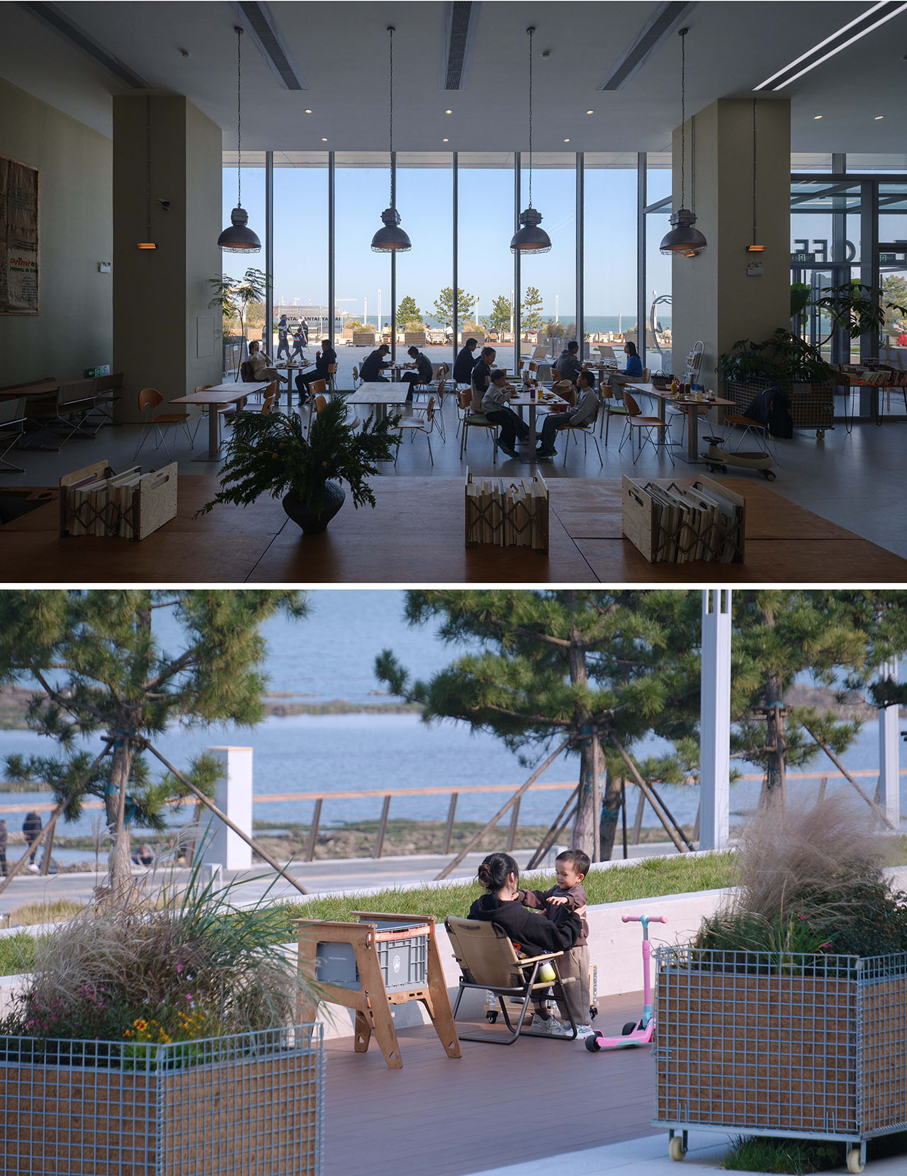 项目于2023年6月启动,室内设计围绕三个核心展开:海边的自然性、城市的文化性与生活的日常性。为精准服务日常市民、会展游客与水上运动爱好者这三类客群,我们梳理出如厕、就餐、休憩、办公、展示六大核心功能,并重点强化“驿站”的公共服务与“展陈”板块