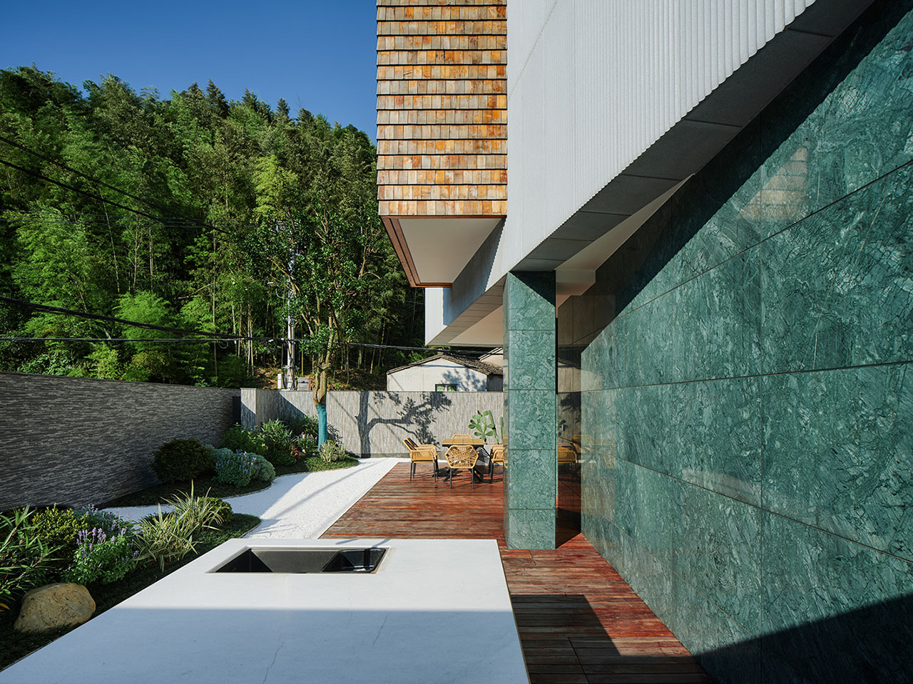 在材料的选择中为了去融入村中的氛围,我们选择了三种色调的石材,灰色、暖白色、绿色,对应的是村中常见的屋顶、土墙、植物。在处理上,主要的灰色细点麻石,我们开了波浪槽口,让它在日光中是可以变化的,暖白色的莱姆石则做了自然喷砂面,让它在晴雨中是可以变化的,绿色大理石则显得稳定做了柔光处理,显得稳定。院墙我们也采用了两种不同材料。沿路的院墙是灰色线条纤维板,稳定不会变色。而内侧的院墙则是灰色水洗石,配合着植物景观,会随着时间变斑驳。
