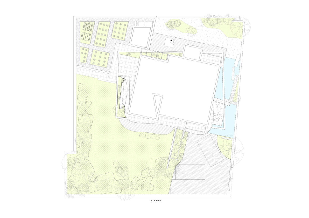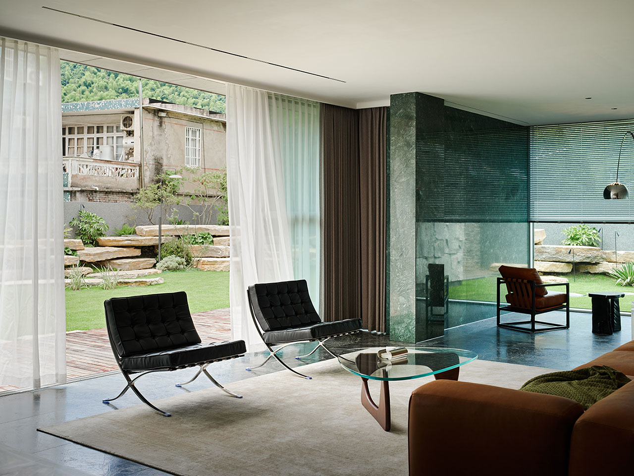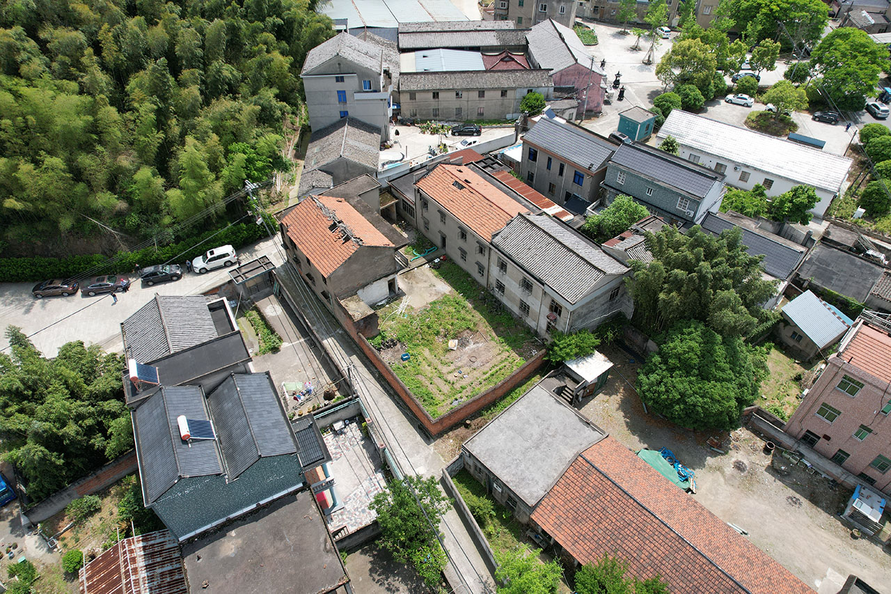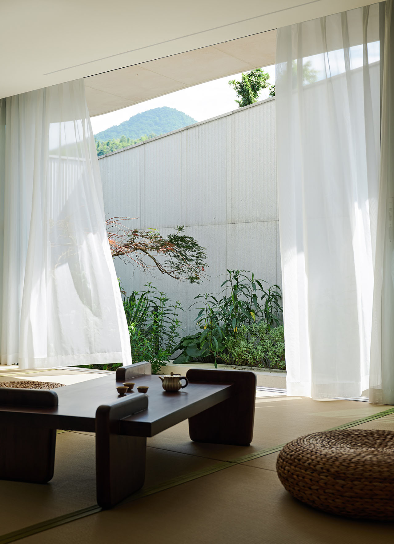 由于庭院很大,处理它变成了我们的首要任务。传统的院子往往被围墙围起来,有很强的安全感,可以晒太阳乘阴凉,是居民最重要的生活场所。同时院子又提供了很舒服的开放性,坐在院内,观的景其实是墙外的村落、山林和天空。所以我们按照村里常见的院落的大小,将整个庭院一分为四,提出了“四季之庭”的概念,用花园、草坪、田地、枯山水四种不同的庭院来表达四季。同时四个不同的院子都与房子相接,玄关接入口的花园,客厅接休息的草坪,后勤空间接种地的田园,餐厅接观景的枯山水,让人能从不同的生活片段里步出到不同的自然中。同时我们也将墙外的景观切成了四段,分别和四个院子搭配,花园望出去的夏叶庙,草坪望出去的邻里,田园望出去的竹林,枯山水望出去的山林,使得原本杂乱的周遭得到有效的控制,并容纳进来。