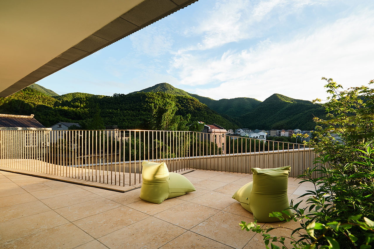 二楼斜墙较矮的那一角,三楼的楼板正好露出来,我们将楼板做了一个曲线的形状,让其和二楼完全脱开,有种漂浮感。而较高的那一角,变成了三层露台的栏杆。整个三楼加上了比较缓的单坡屋顶,呼应立面上的斜墙元素。特别在北立面上保持横向的完整性,而在南立面则断成两个小房子,尺度缩小,更有一种“家”的原型感。西侧做了一个很深的挑檐,一方面应对西晒,另一方面提供了舒适的檐下空间,在大露台上可以眺望远山。