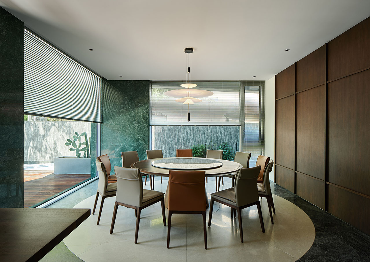 一层的室内,为了和庭院结合,四道分割院落的墙体会延伸进室内。我们将其摆成风车型让其互相错动,使得室内的空间在分割的基础上也有适当的联通和互望,甚至一直了联通进庭院,让整个的一层空间处在一种可以漫步的状态。从餐厅走到客厅,还是从客厅推开门进入庭院,接着绕着院墙,穿过几个庭院,再回到室内,都不会有特别的分界感。我们希望均匀的把生活感铺满了整个场地。