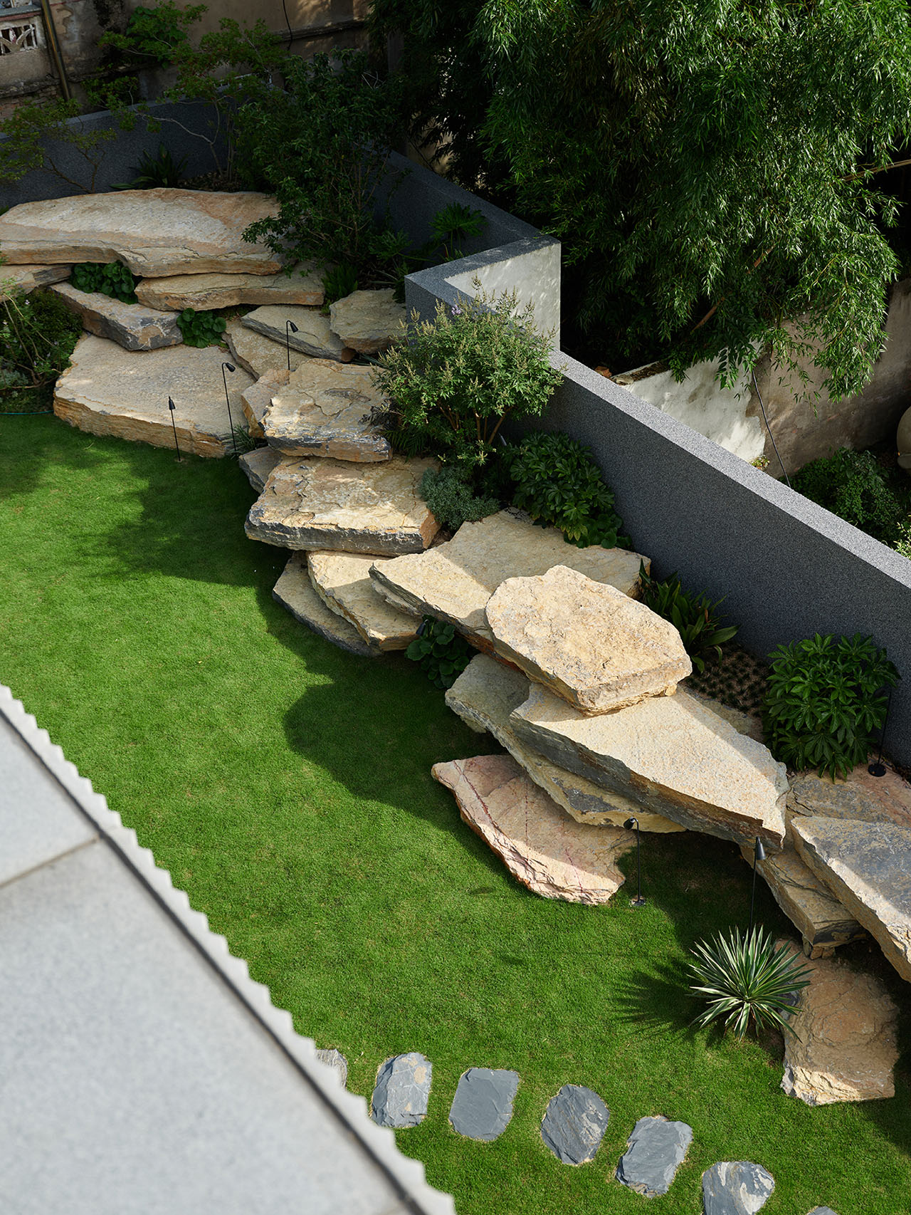 整体来说,这个房子在乡村是个“新”建筑,但过上舒适的现代生活契合了村民们最朴素的愿望,只是村民们在建造自己的居所的时候会不自觉隅于乡村的惯性,建造出方方正正和双坡瓦顶的新农村住宅。我们的供应商和施工方都是本地人,但是在建造过程中,提供的材料和技术,却是非常专业的。例如我们在布置庭院的叠石时,从山东收了荒料,清洗运送后,使用无人机拍摄,制作出精确的三维模型,设计完毕后,在现场放线校对,最后用吊机吊装调整。一层的深灰色酸洗大理石,也是在现场进行了反复推敲和比较才敲定,让其有较明显的凹凸,但是又很温润,踩上去很舒服。