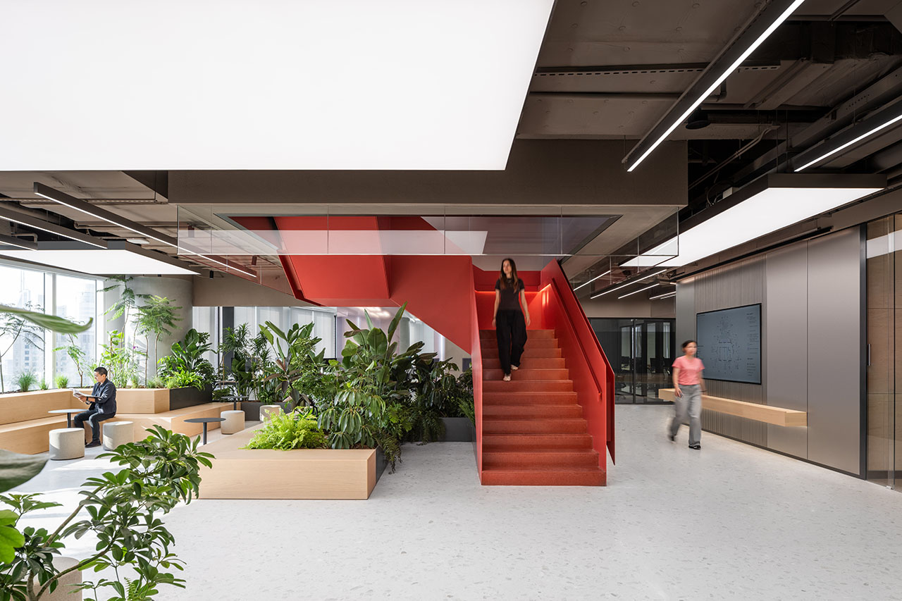 充满雕塑感的中央楼梯是联系各层的另一个要素。作为一个物理层面和社交层面的枢纽,它不仅吸引人们在上下楼层之间走动,而且创造了结识新同事的机会。在高密度的高层办公环境中,团队凝聚力容易因物理分隔而减弱。这座楼梯将整座总部化身为一个充满活力的社区,有效打破这种隔阂,重塑空间凝聚力。