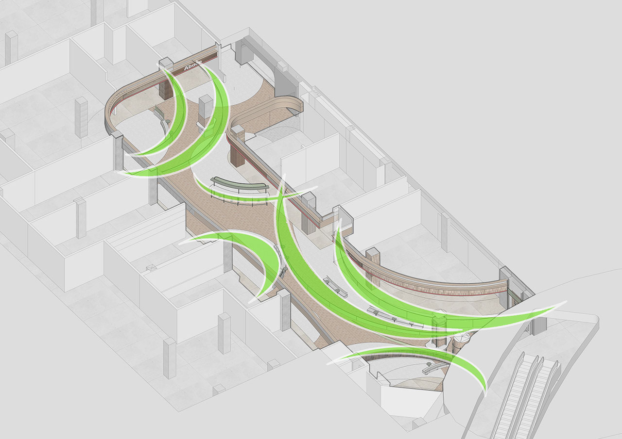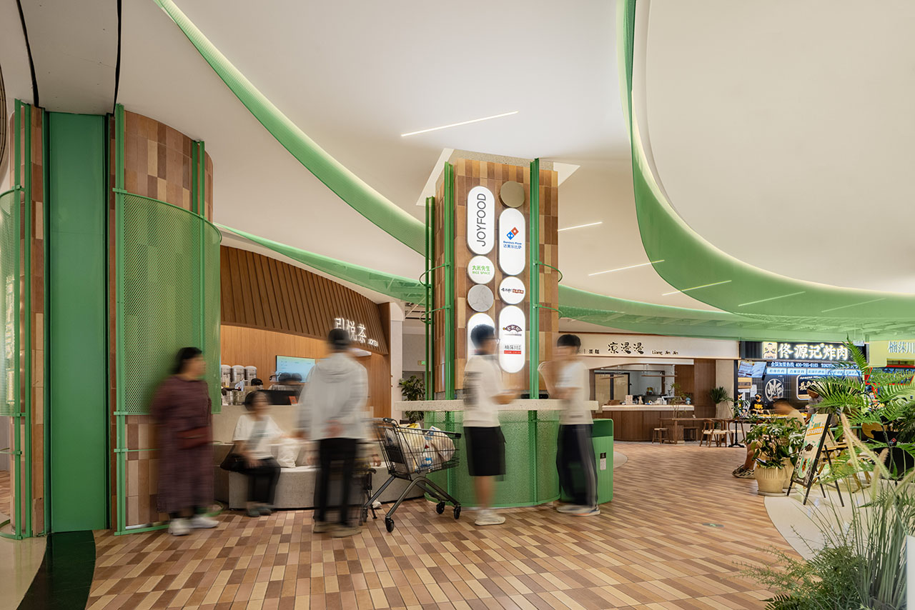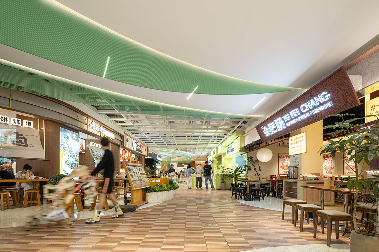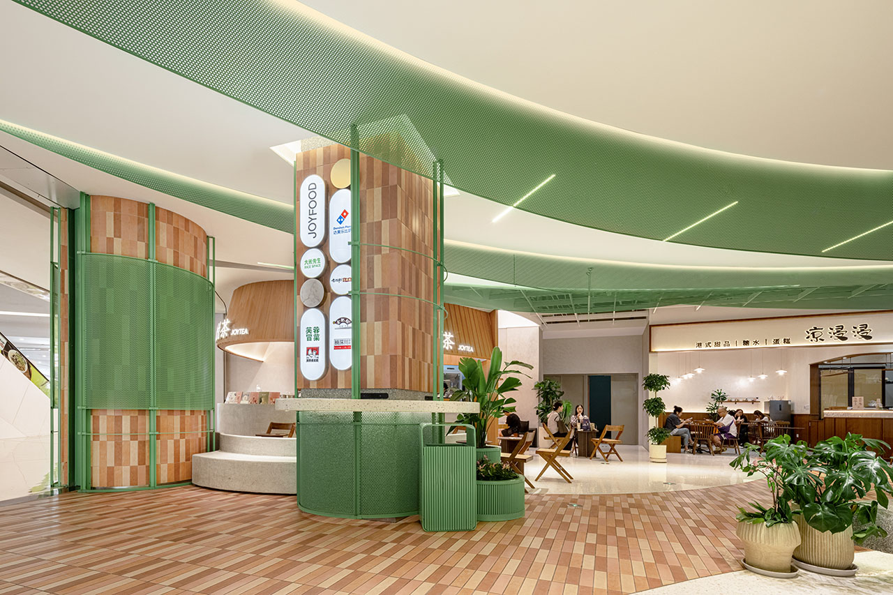 上部空间(顶部区域)以 “莲叶” 为原型,在形态、材质及色彩上,采用具有绿意、轻透、明亮特质的金属穿孔卷材作为设计元素。