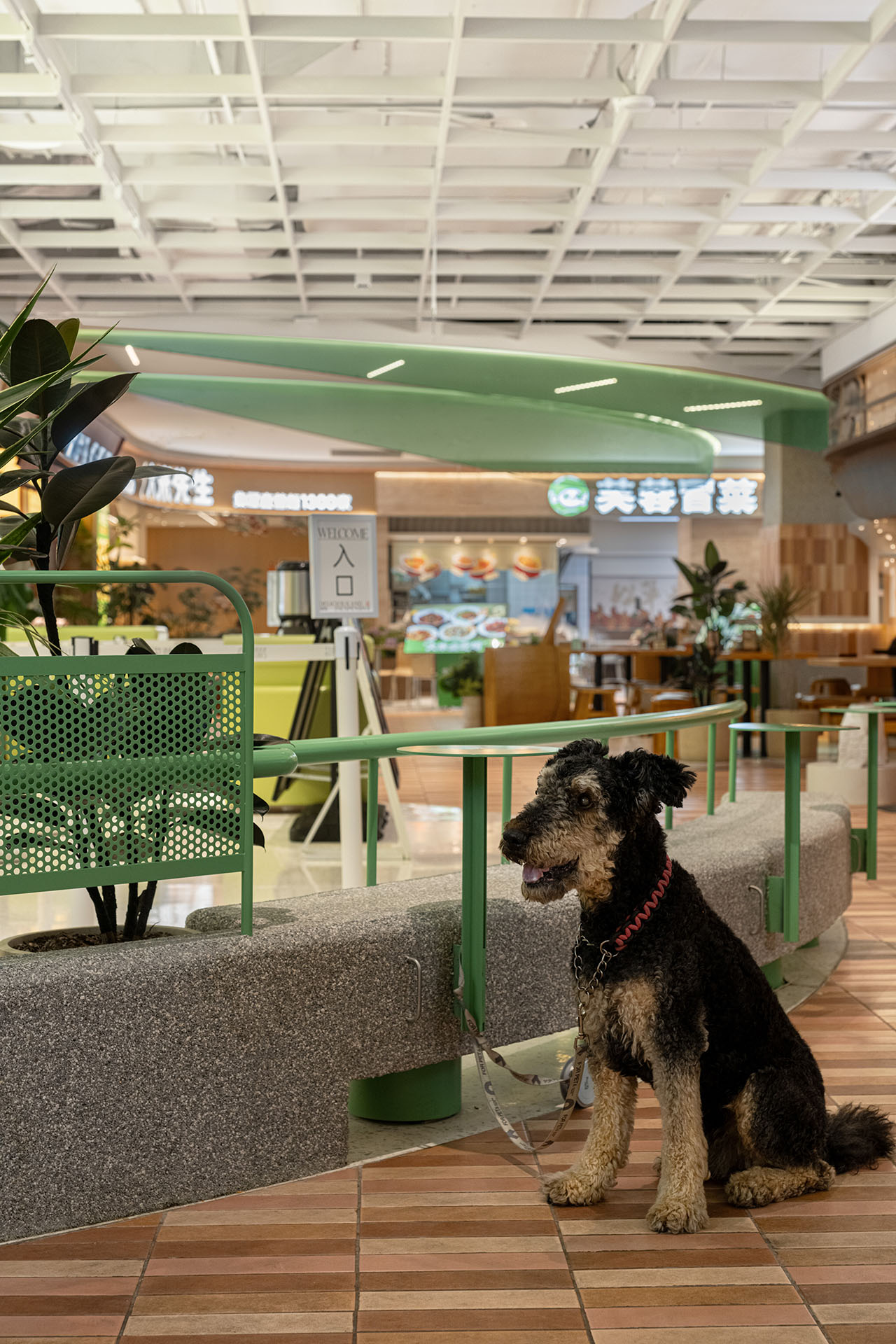 面向公区设置曲线条凳,界定了商铺与公区的边界,可提供充足座位以优化公区氛围。条凳配备一体化小圆桌,并设有宠物友好型停靠把手,以丰富场景及满足需求。