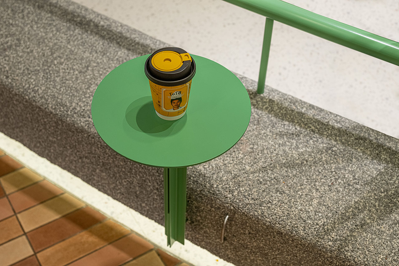 柱上设置漂浮台面(站立高度),用于电子设备临时充电、人员等待及超市购物后的临时放置。