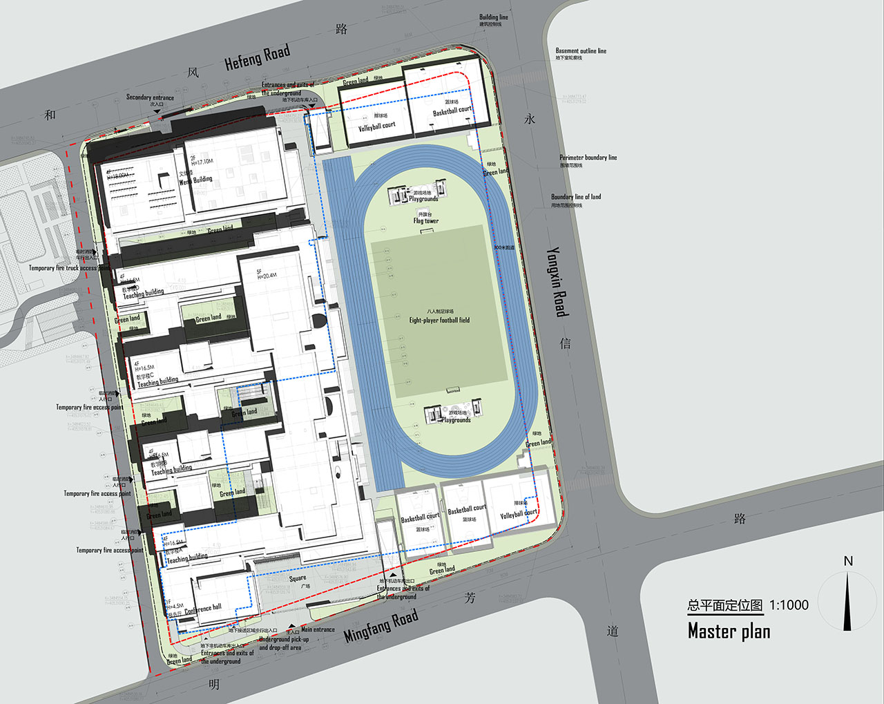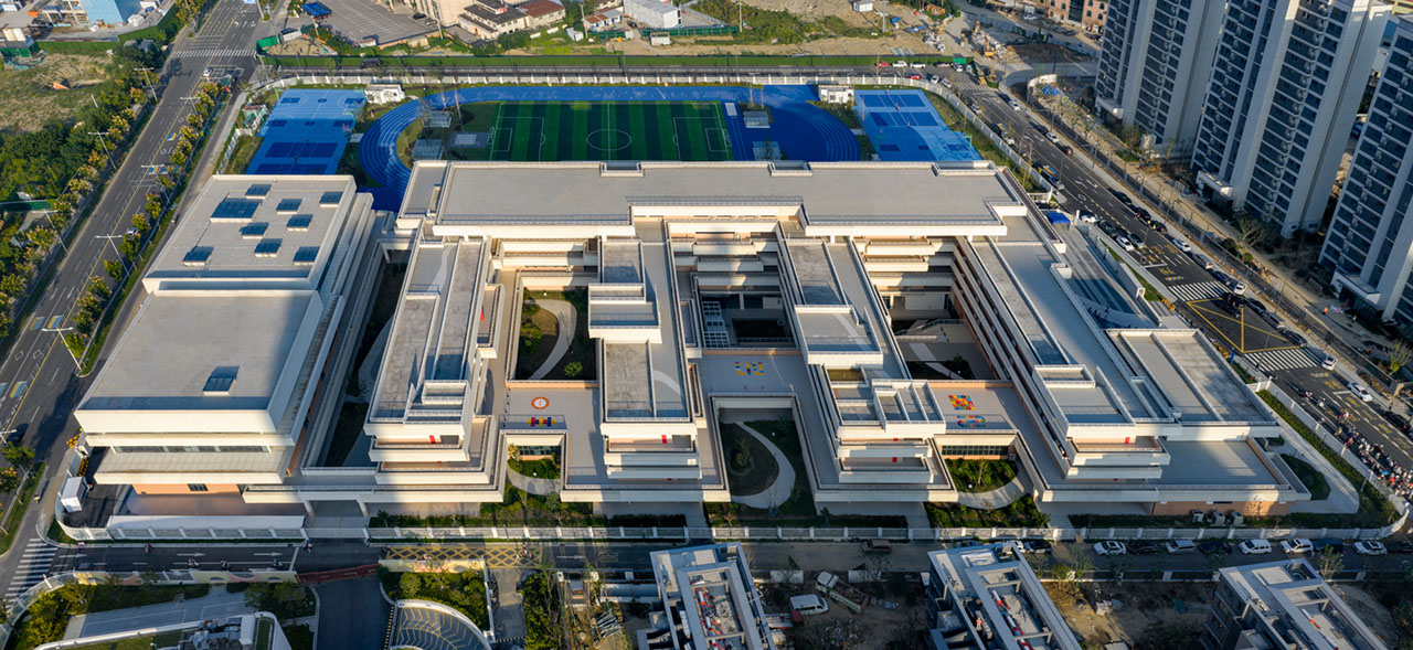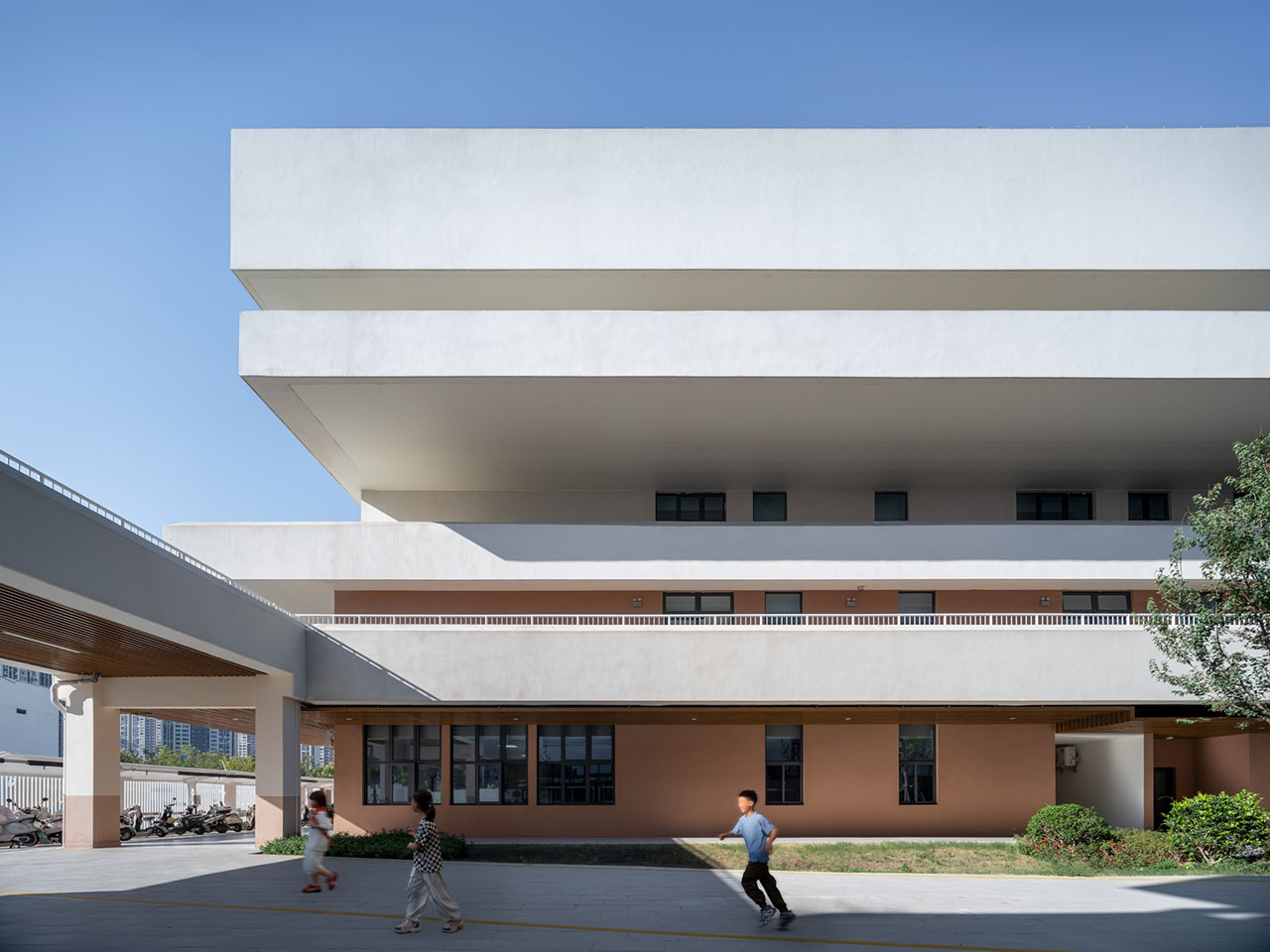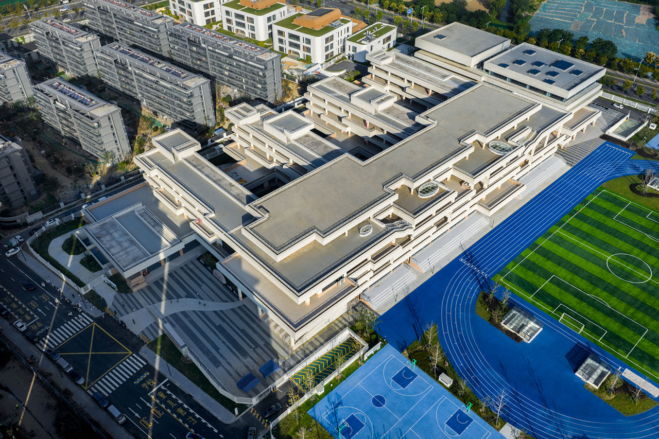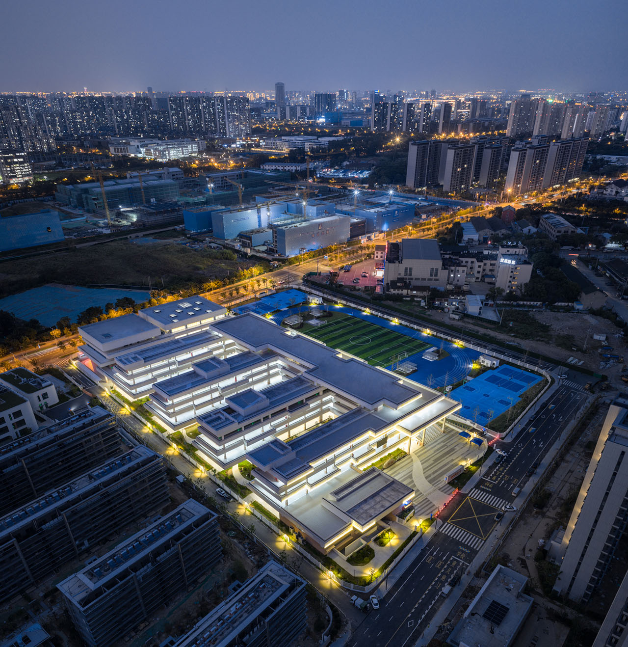 学校占地面积约3.7万平方米,设计规模为60个班,可以容纳2700名学生。用地规则,周边是新建城区,设计的开始就是寻找一个合适的叙事语境,为建筑赋予深层次的意义。这种意义与建筑师的个人经验相关,也与建筑师对于城市、地域、环境的认知相关。