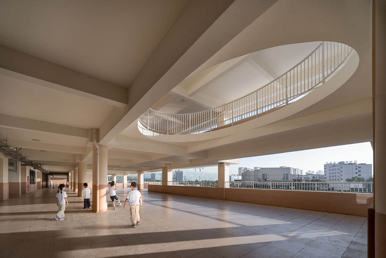 盎然是“盈溢和充满”的意思。在生命的成长阶段,我们需要塑造一种积极向上的环境气氛,建筑希望将这种充满正量的概念植入其中。采用浅色的外墙和木色的装饰,营造更加温暖的氛围,空间的流动性和处处的来自于阳光和风的自然惊喜,蕴藏在不同的行进和发现当中,这是一种来自于生命的乐趣。课间的10分钟,在教室周边都能找到精心设置的活动区域,屋顶一反乏味的消极,形成了接触自然的良好平台。操场和建筑也不是单纯并置的关系,而是结合为一体。不同方向光线和影子的引入,将建筑变得层次丰富。任何一个角度都能够看到不经意的自然和人工的秀丽。在越来越艰苦的时代竞争当中,我们希望这个新的校园建筑能成为一个成长过程中的精神堡垒。