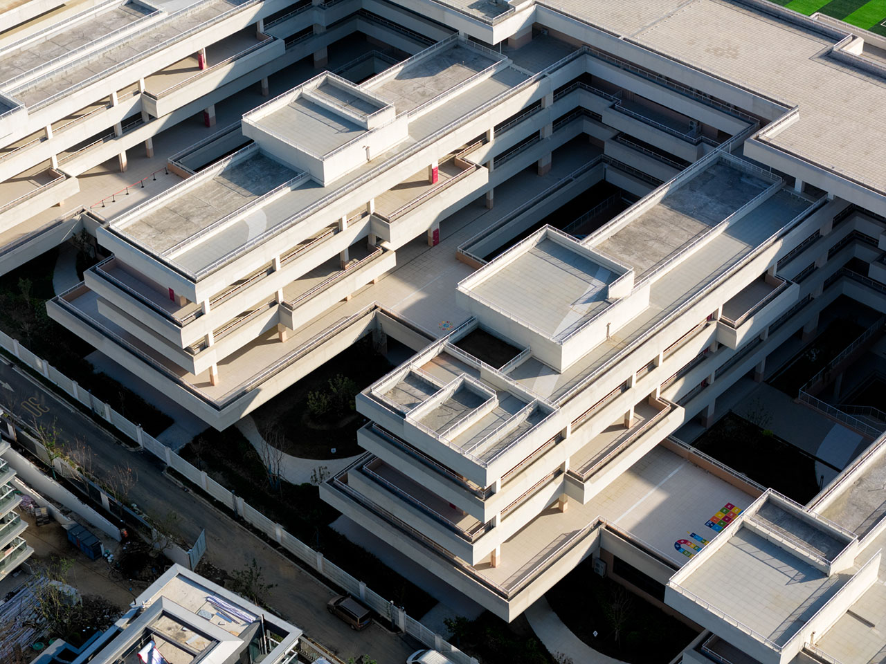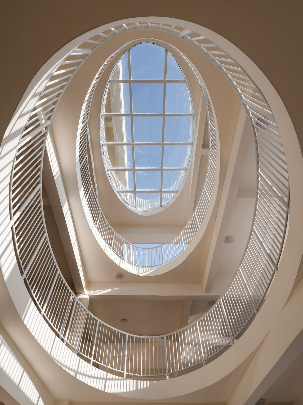 建筑体一如沉积岩形成的结构特征,重叠的楼板以在重叠部分之间产生差异的方式将不同的大小和范围合并在一起。在某些部分应用了类似的重叠策略(例如:以 900 的模数相互搭建与交融),不同的空间汇集在一起,彼此之间建立了体积关系。