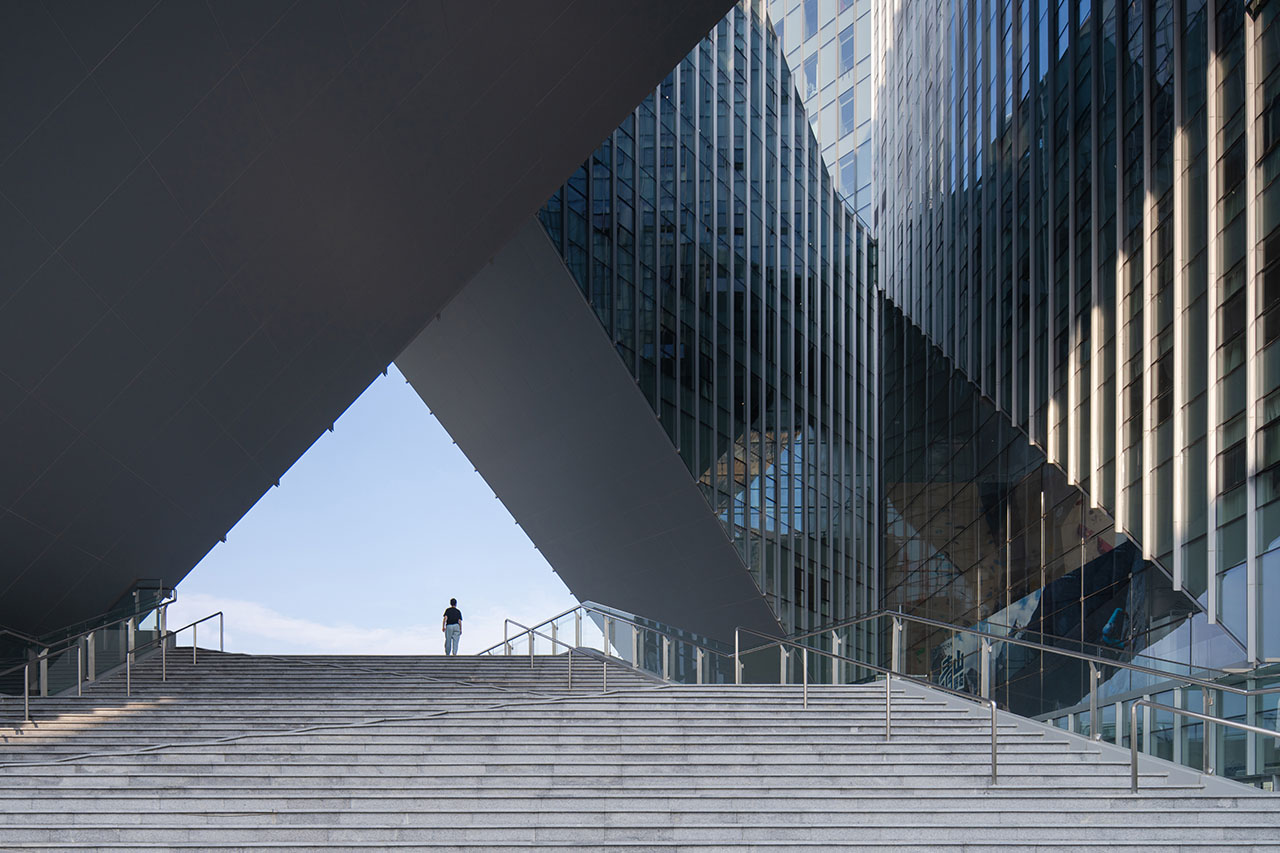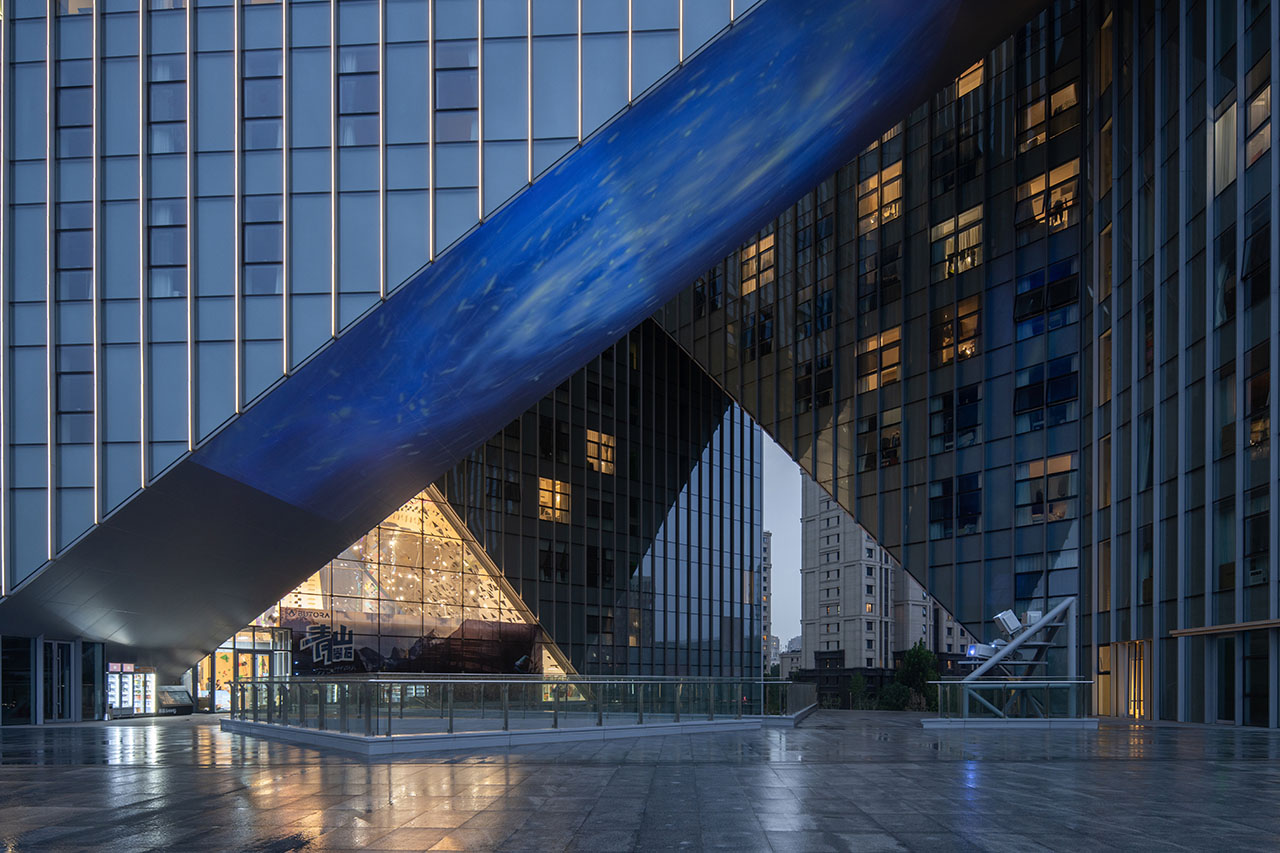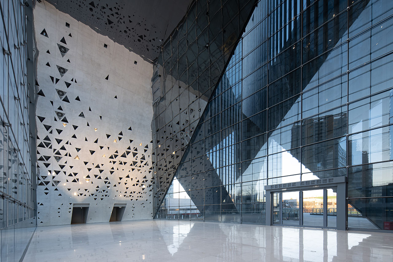 三个方向的三角形开口被塑造为不同主题的活动场所,让建筑成为青年文化与城市生活的“缝合剂”。空间在这里呈现出更多维度,建筑三角形的内庭面向天空,形成起伏的轮廓,在二层、首层和地下一层又演变为相互连接的空间网络。建筑立面中三个方向三个巨大的、三角形开洞伴随着光影将城市景观引入其中。