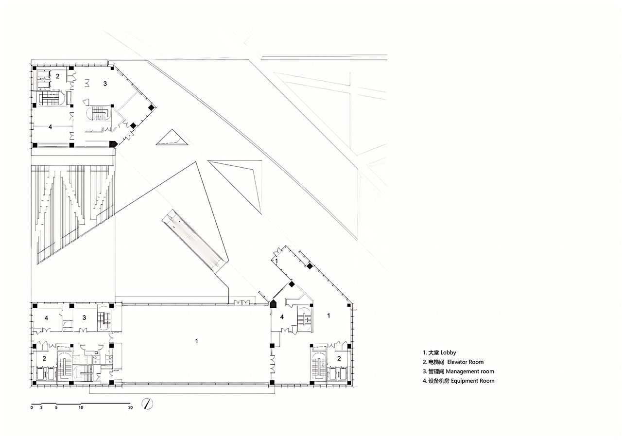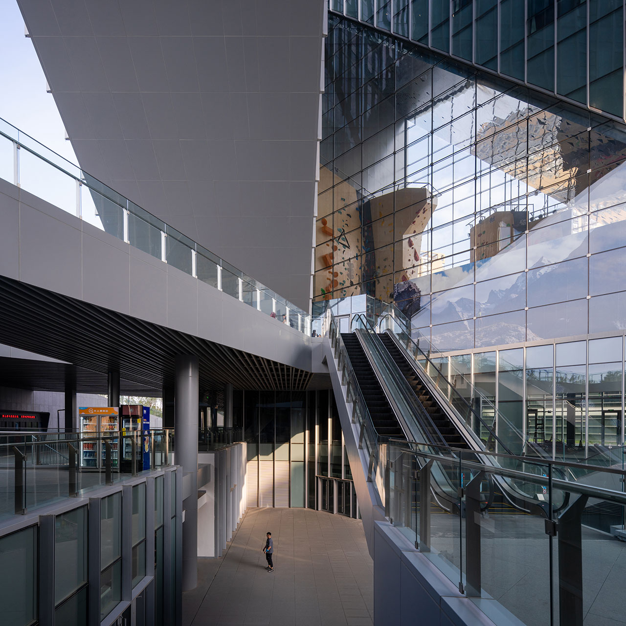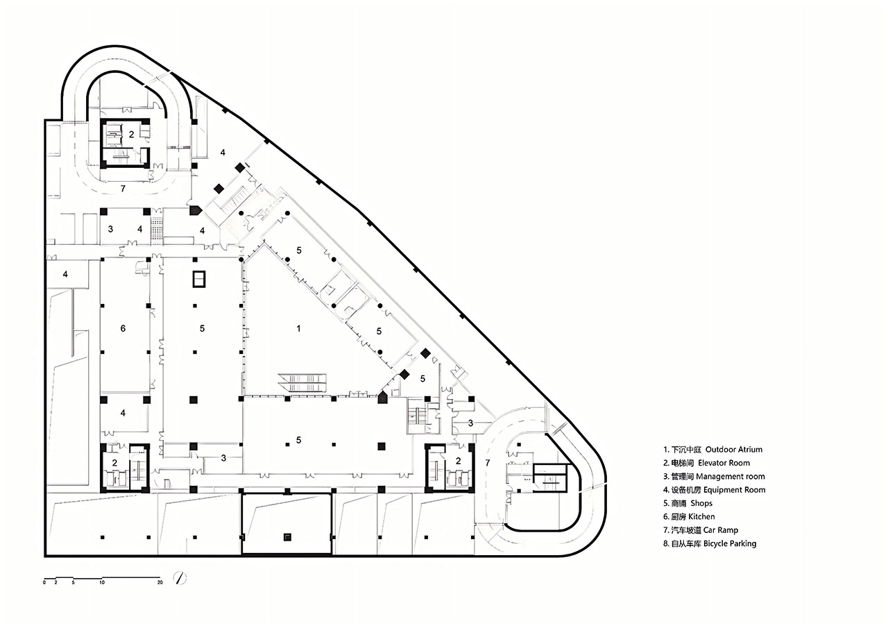 三个方向的三角形开口被塑造为不同主题的活动场所,让建筑成为青年文化与城市生活的“缝合剂”。空间在这里呈现出更多维度,建筑三角形的内庭面向天空,形成起伏的轮廓,在二层、首层和地下一层又演变为相互连接的空间网络。建筑立面中三个方向三个巨大的、三角形开洞伴随着光影将城市景观引入其中。