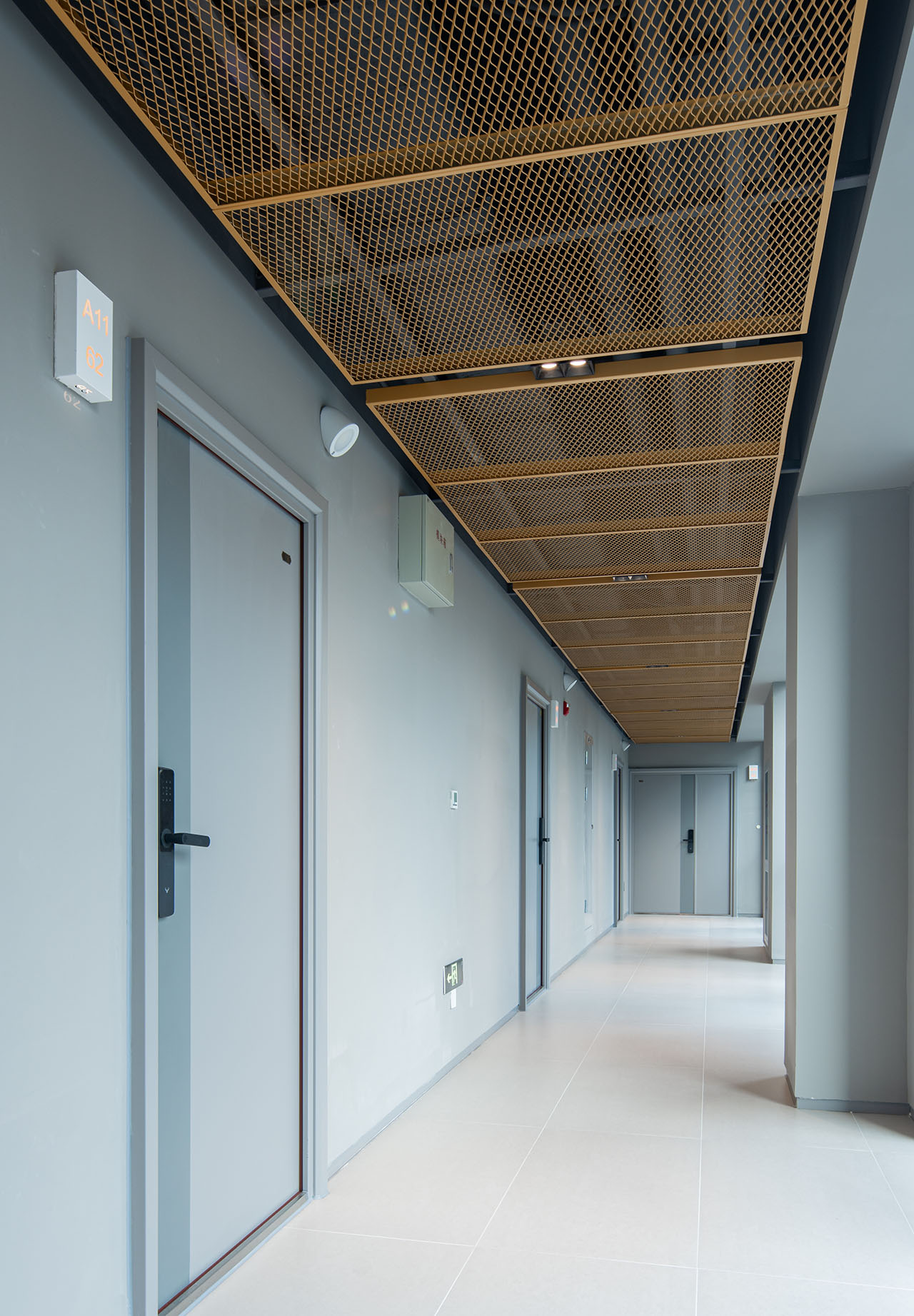 建筑内部通过清晰的功能分区构建起空间秩序。为满足消防规范,将连续的建筑体量划分为三个部分,分别成为一个独立的消防分区。从门厅到电梯厅,从走廊进入公寓,形成从公共到私密的递进的关系。