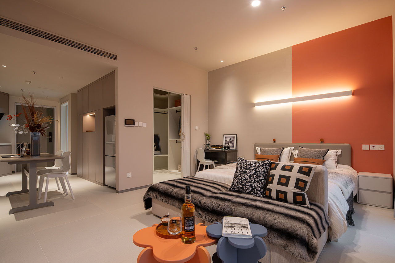 10层以上退台提供观景露台,西山与城市景观一览无余。户型从单身公寓至复式套房,均采用可拆卸隔断与模块化家具系统,支持居住与办公的自由切换,适配科技创业者的多元需求。