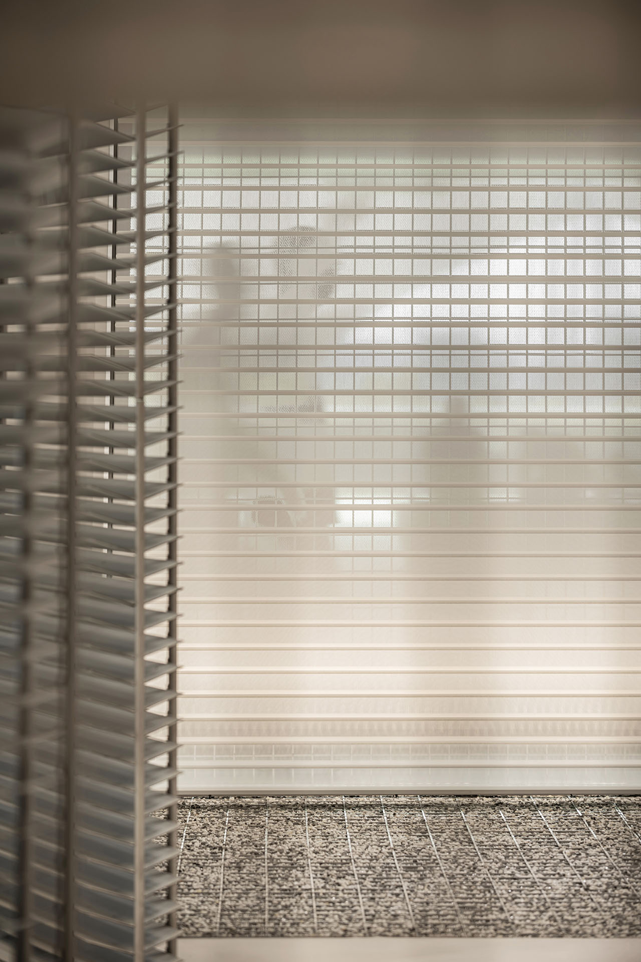 将入口处的两扇门置入LED屏幕,灯光反射到百叶帘,呈现出一双大眼睛的影像,与每一位驻足者对视,制造一场无声的对话。