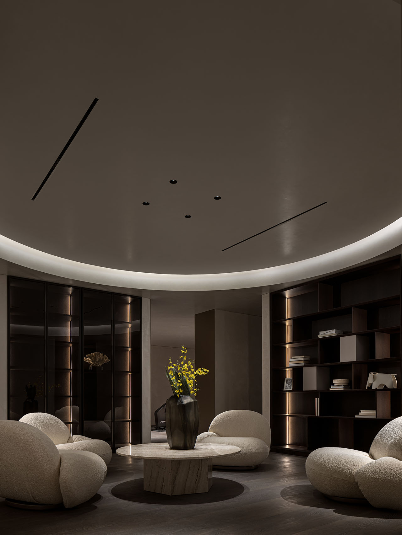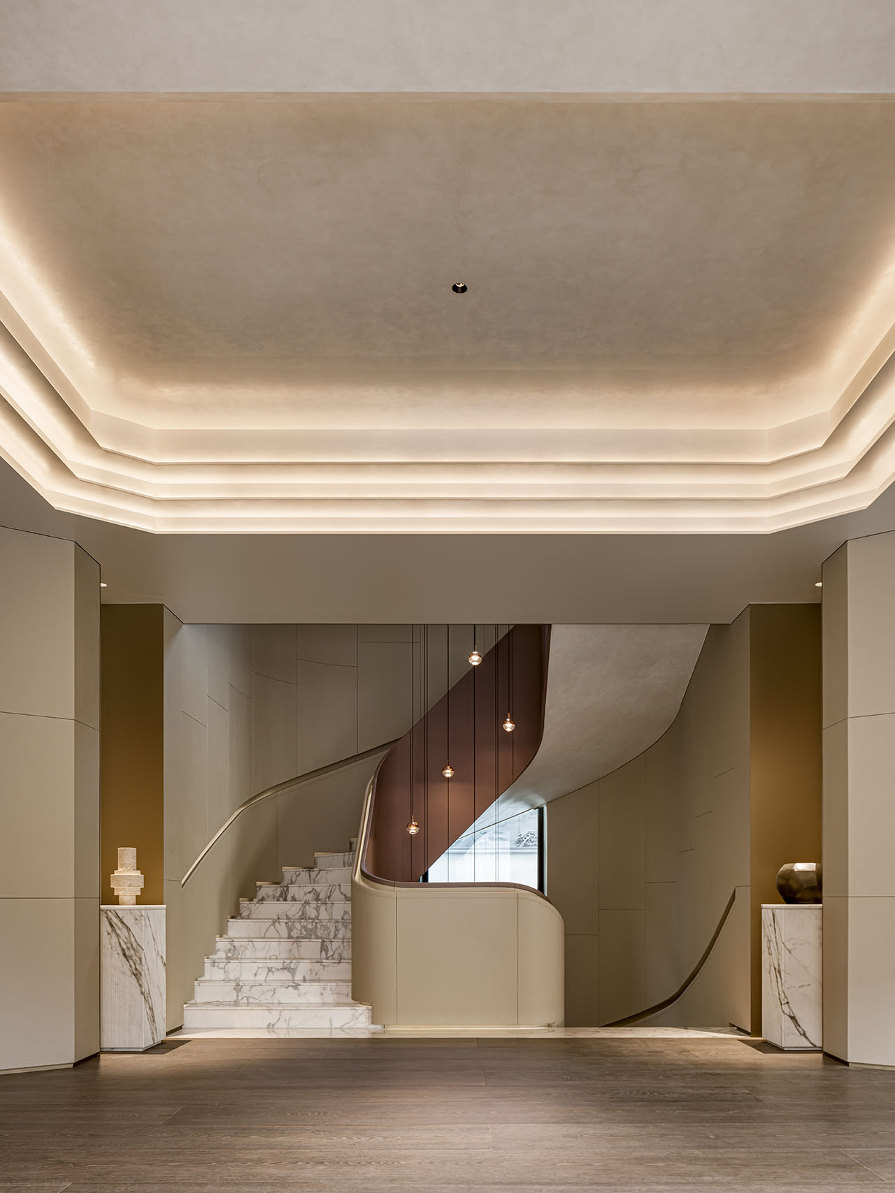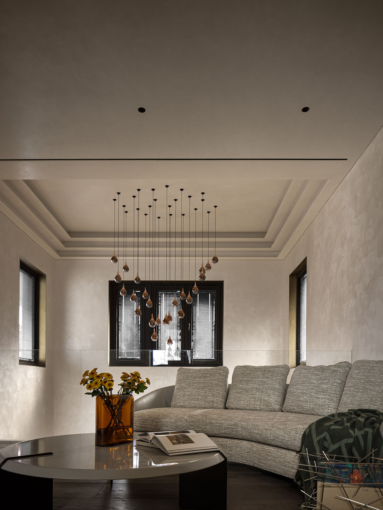 理想唯美的空间创作无需堆叠,设计师运用极简“留白”设计手法,鉴于大宅空间的尺度放弃了传统的纯色乳胶漆,取而代之的是大面积运用由天然矿粉发酵混合而成的意大利DANILO艺术漆。如同油画绘画般工艺,一层一层纯手工粉刷制作,艺术漆内在丰富的颜色与质感自然无序的方式排布,恰好在保持简单底色的基础之上,为空间带来丰盈的质感和玩味。在设计师的设计哲学中,光是空间设计的灵魂,在质感非凡的1600㎡的空间中,唯有进门挑空区与楼梯挑空区运用了错落有致的水滴状线状组合吊灯。其他空间均采用无主灯设计手法,无边射灯与无边线性风口的设计与顶面完全融合为一体,尽显极致美感,柔美的线性灯带精巧地分布在玻璃栏杆底部、局部线性叠级天花灯槽内侧、开放式柜体内侧、匠心别致的石材背景及真皮背景墙等内侧,律动与秩序感并存,与空间质感相互映衬,诗意且温润。室外光线的变化,源自时间与天光;室内光线则随主人心境内敛流动,内外光影掩映中,墙体漆面也随机参与其中,“仿佛若有光”,奇妙的化学反应如同桃源中的灵动景色。