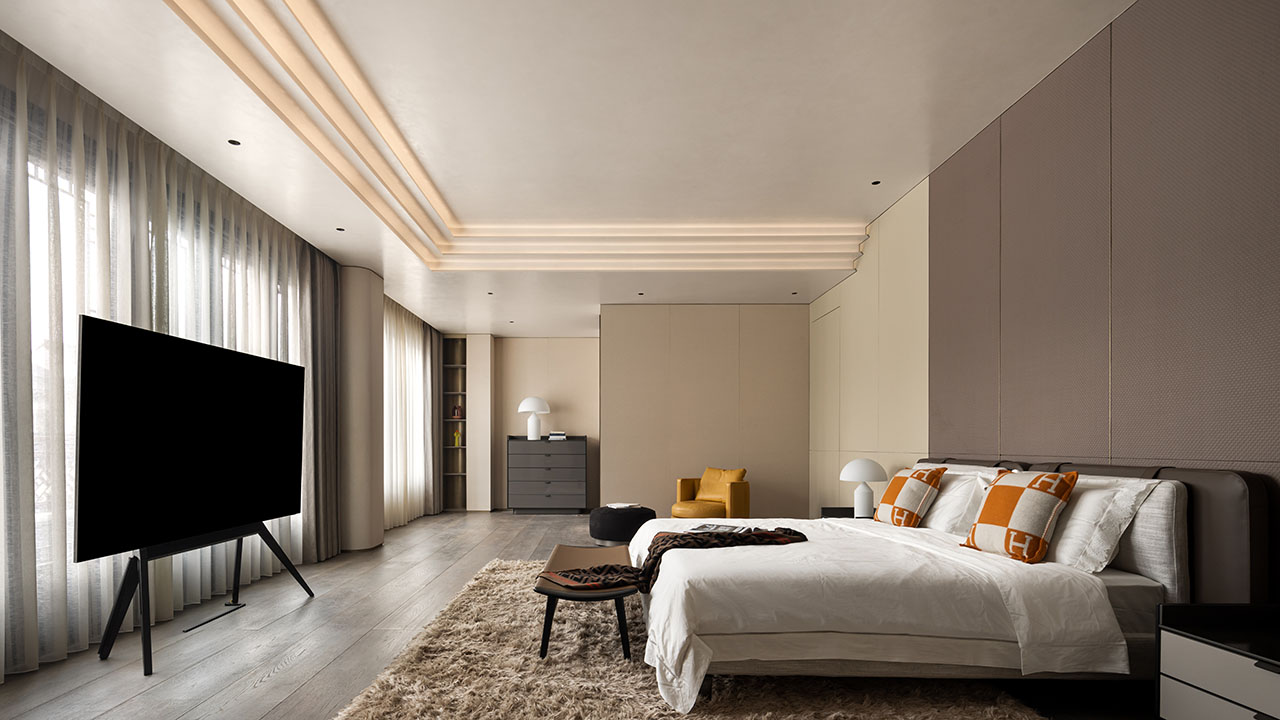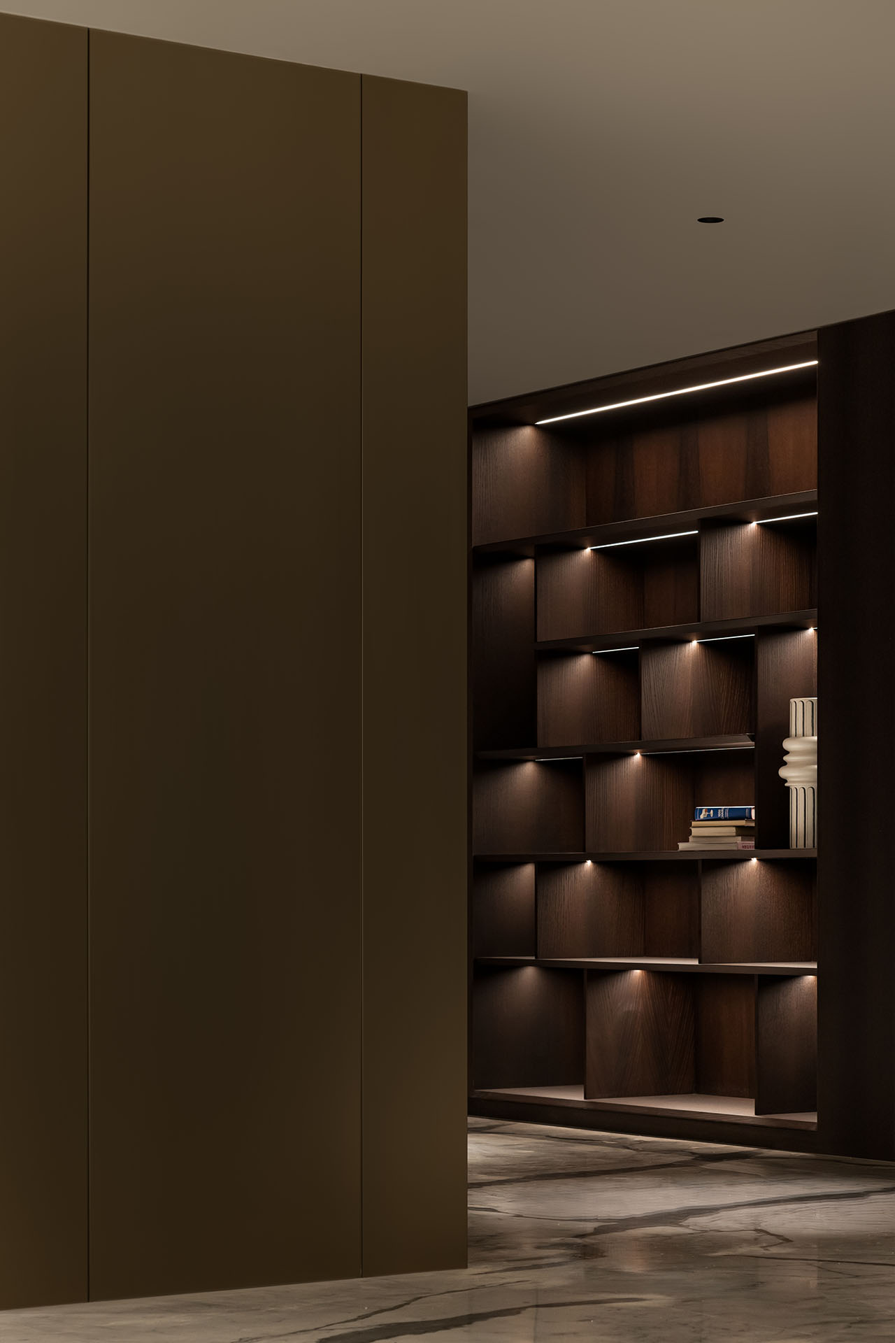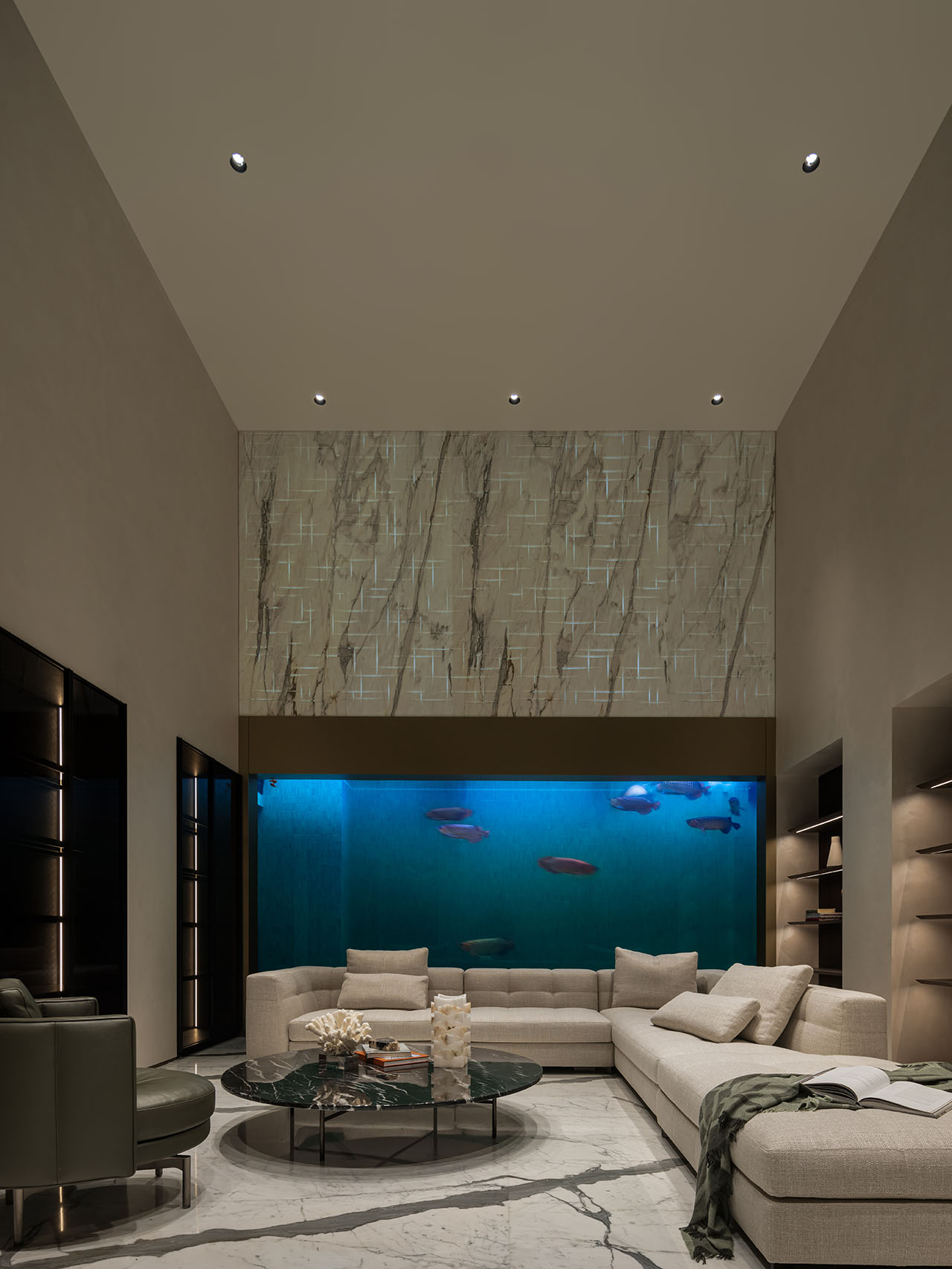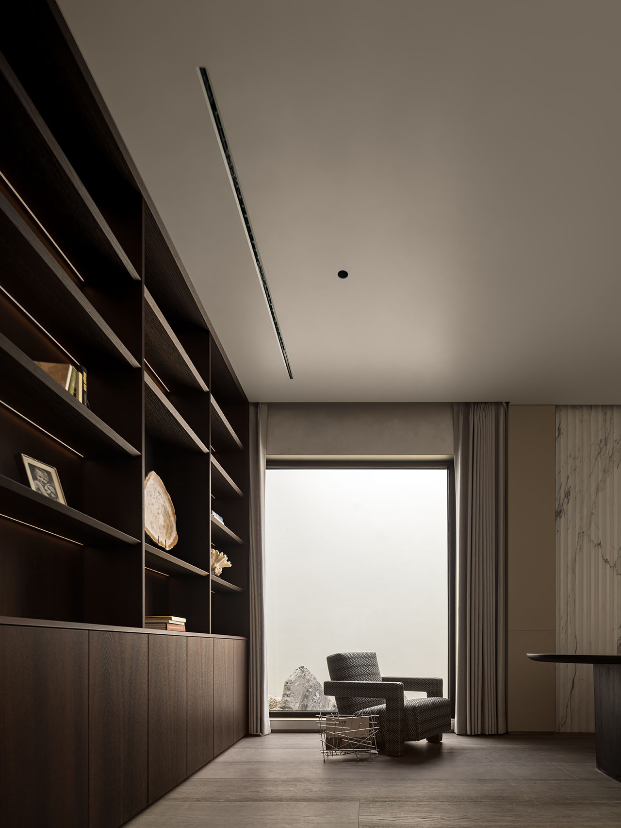 理想唯美的空间创作无需堆叠,设计师运用极简“留白”设计手法,鉴于大宅空间的尺度放弃了传统的纯色乳胶漆,取而代之的是大面积运用由天然矿粉发酵混合而成的意大利DANILO艺术漆。如同油画绘画般工艺,一层一层纯手工粉刷制作,艺术漆内在丰富的颜色与质感自然无序的方式排布,恰好在保持简单底色的基础之上,为空间带来丰盈的质感和玩味。在设计师的设计哲学中,光是空间设计的灵魂,在质感非凡的1600㎡的空间中,唯有进门挑空区与楼梯挑空区运用了错落有致的水滴状线状组合吊灯。其他空间均采用无主灯设计手法,无边射灯与无边线性风口的设计与顶面完全融合为一体,尽显极致美感,柔美的线性灯带精巧地分布在玻璃栏杆底部、局部线性叠级天花灯槽内侧、开放式柜体内侧、匠心别致的石材背景及真皮背景墙等内侧,律动与秩序感并存,与空间质感相互映衬,诗意且温润。室外光线的变化,源自时间与天光;室内光线则随主人心境内敛流动,内外光影掩映中,墙体漆面也随机参与其中,“仿佛若有光”,奇妙的化学反应如同桃源中的灵动景色。
