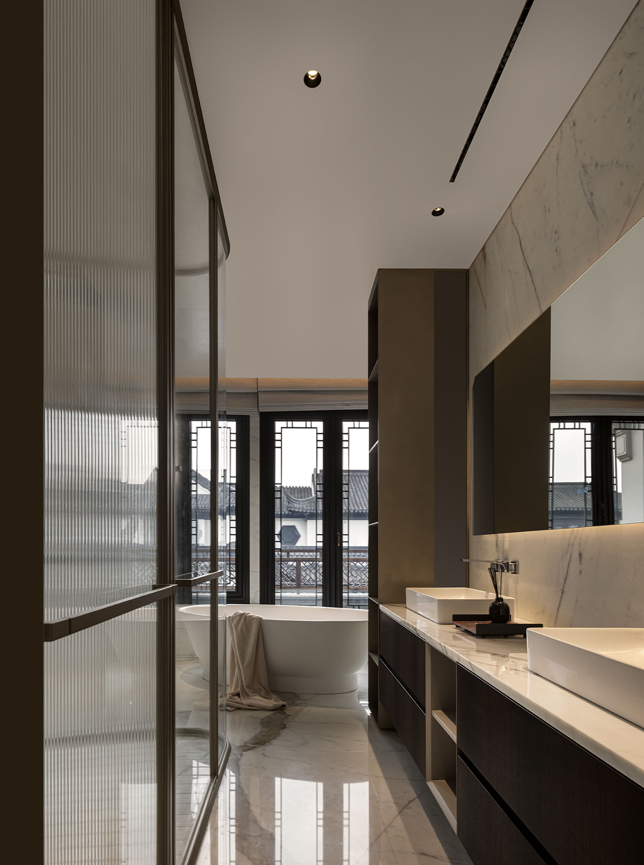 于建筑外观考量,这处宅邸本就具有与众不同的灵魂与基因。苏派建筑清新脱俗的灵秀内涵,为空间奠定了风雅调性。陶渊明文中”心远地自偏“的心境,在当代有了更加从容舒展的可能。精巧地局部山水令家主人在繁华都市中,也能拥有隐逸风雅的生活。那不是离群索居,远离世俗,而是大隐隐于市,返璞归真。