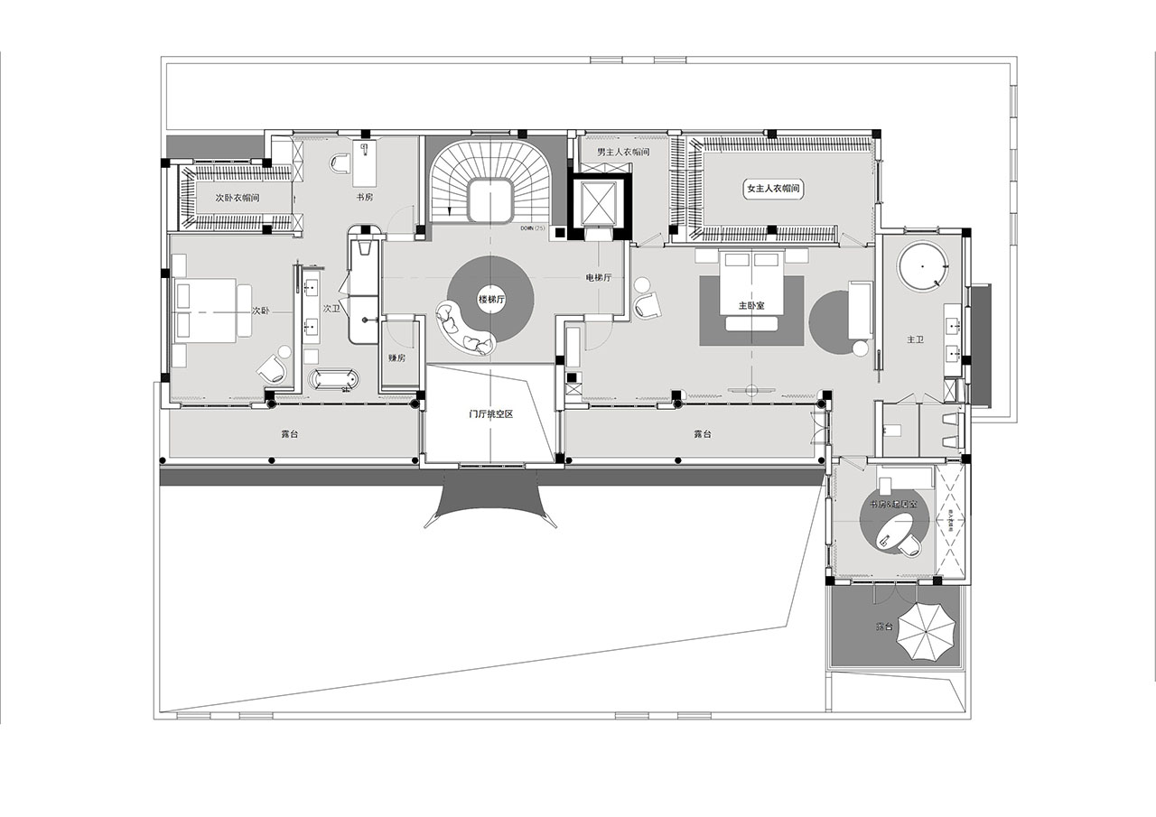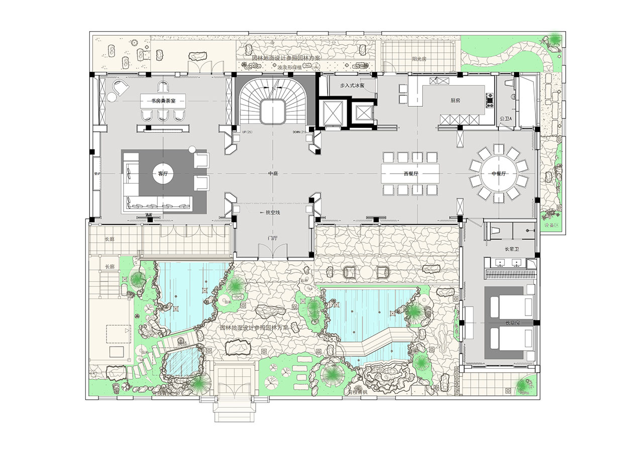 宅邸由地上两层和地下两层组成。顺应光照及居住舒适度与家主人的习惯,设计师自然而然将二层规划为主人一家的套房区域,将一层作为生活的公共区域,容纳客厅、中西餐厅,长辈房,与开阔的中庭。抛弃了琐碎的空间利用旧理念,二层一共只容纳了两组套间。男女主人的衣帽间,大体量的卫浴空间,公共区域,下一代的完整起居空间都获得了宽松尺度。在设计师看来,大宅设计的基点是结构层面的去繁就简,是剥离非必要的复杂性,更清晰地理解生活周遭。