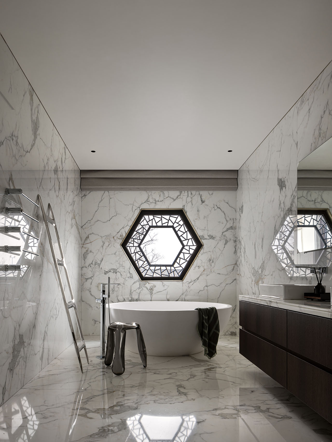 在这座宅邸中,雅致的金属、高贵的牛皮、自然的木纹与隐奢的鱼肚白大理石、质感的艺术漆交相映衬,“落英缤纷”。设计师在创作过程中,熟练掌握各种材质的特性,与家主人共同研发了适合本案的钛金手工合纹不锈钢金属构件,引入奢侈品的皮缝线工艺及编制皮工艺,隐奢的鱼肚白大理石进行不同手法的三维雕刻,并在局部背景石材进行了透光设计,宛如璀璨星河,独具匠心。4米长浅灰褐色系的宽幅木地板上保留了橡木原生的树结,令空间温暖的同时也为其附加了一层自然的灵动。