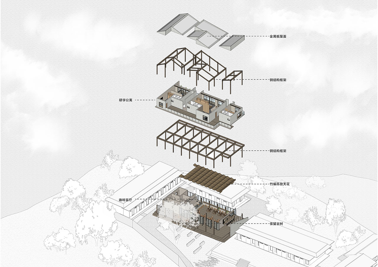 场地踏勘之时,建筑的钢结构柱网基坑已然成型,旧规划方案中的客厅设置在原有小学教室与宿舍的中间,整体连成线型空间格局,却也隔开了场地空间中庭院景观与外侧山体自然森林的呼应关系,故此咖啡客厅的设计作为连接场地的元素而诞生。