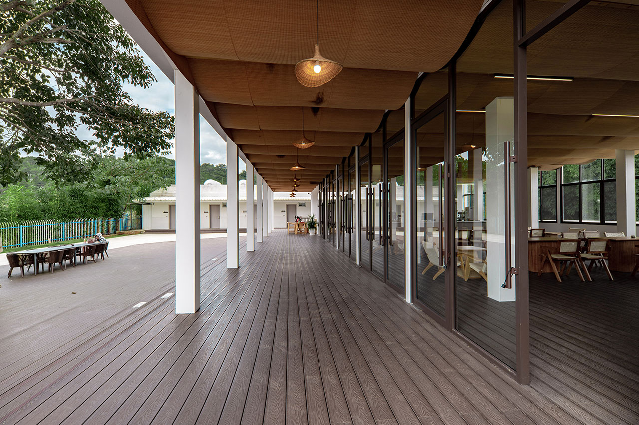 在院落整体布局方面,我们对院落的景观布局进行调整,保留一定程度的运营灵活性。我们希望场地内预留出的木质活动平台与休闲草坪能够容纳更多的社区活动,使得众多研学学子更好地融入到当地居民社区生活中。值得一提的是,在项目建设中,或许是出于某个灵光一现的念头,原本分离的客厅与小学宿舍被一座钢结构玻璃楼梯连接起来,通过对小学宿舍屋顶的利用增添了院落的活动空间,增加了社区活动中院落的观赏空间,人、乡村、自然在这一刻得以融合,这才实现了农村社区的共建共享,得以一同拥抱的自然馈赠。