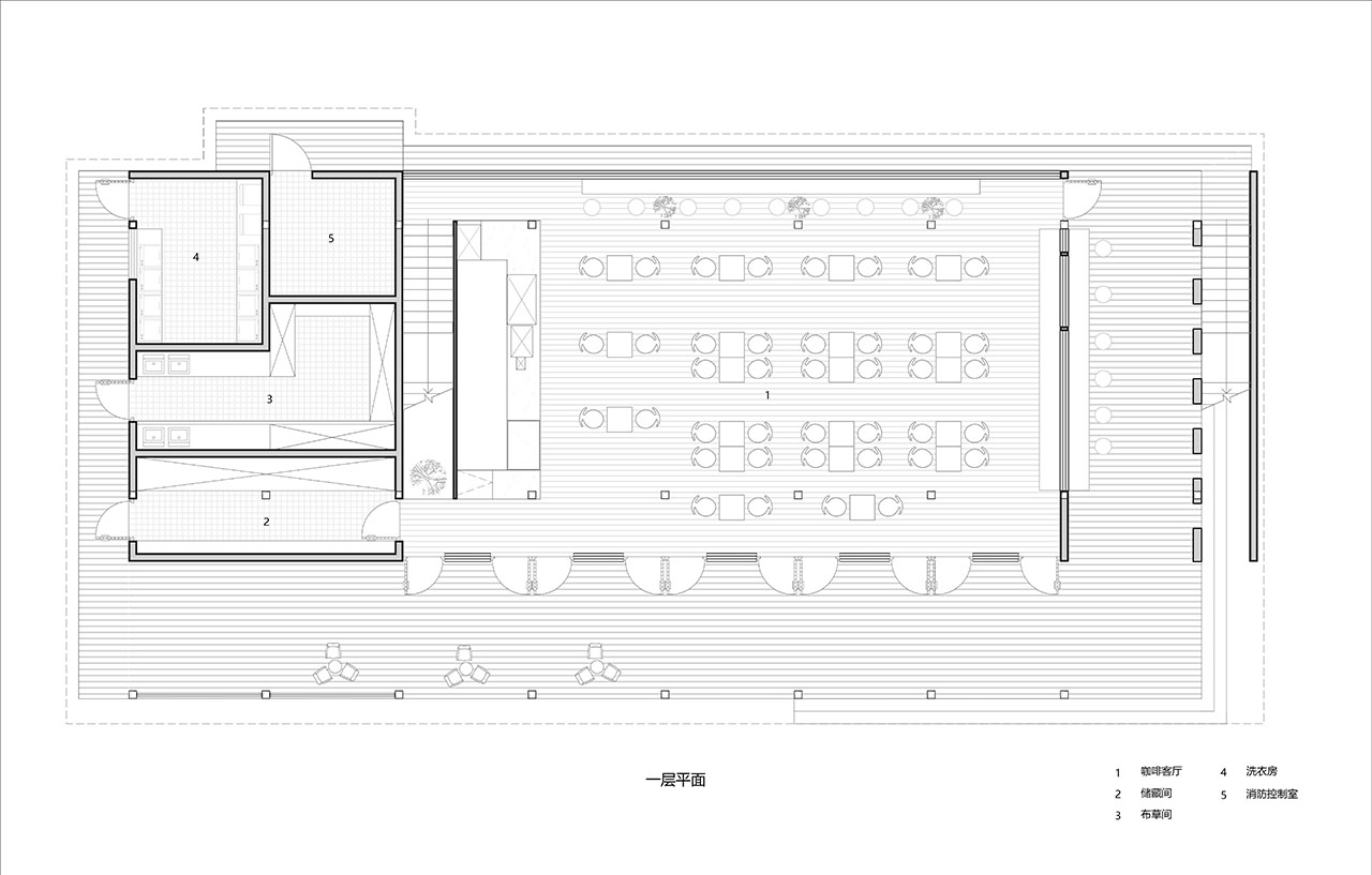 一层的咖啡厅南侧以多扇可开启透明玻璃门为界面,配合游廊形成半开放空间,我们希望以这样的多层次处理,让人在回味咖啡时得到于院内古树环境相接触的体验,而北侧则以离地1m的玻璃窗配合长吧台,人在此在眺望远山自然风景后,抿一口当地咖啡,融入到云南山野乡村的质朴之中。