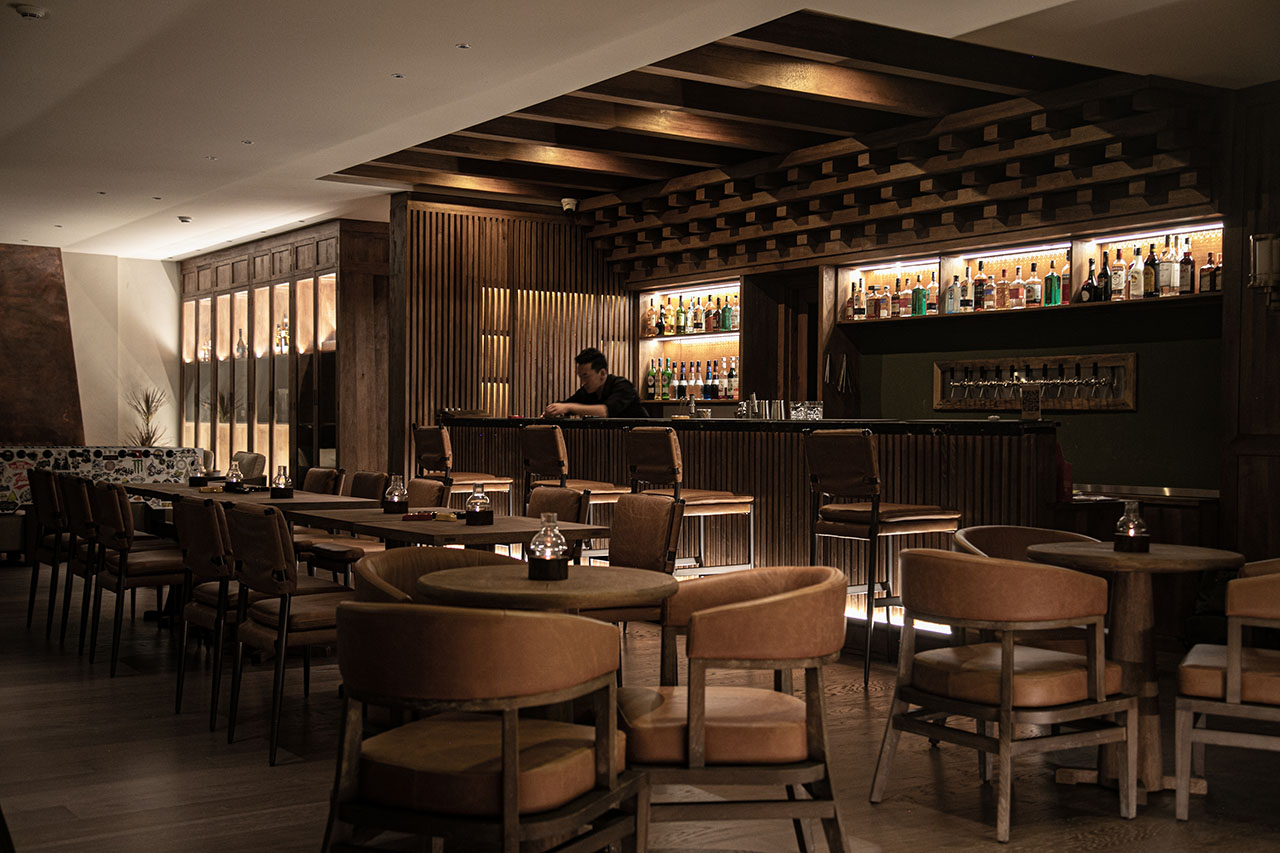 吧台作为酒吧空间里最为重要的功能区域,也会在视觉上自然成为整个空间的重心,因此需要重点考虑。在本案中,吧台是整个空间体现在地属性的核心区域,通过在吧台区域运用传统藏族建筑的结构特征,来赋予场地更具空间立体感的体验。在吧台构造上,主体结构承袭传统藏式榫卯工艺,由香格里拉本地匠人选用当地核桃木精工拼接而成,实现结构与装饰的完美统一。天然石材台面与实木货柜墙板,无不延续着对当地传统材料与精湛工艺的尊重。