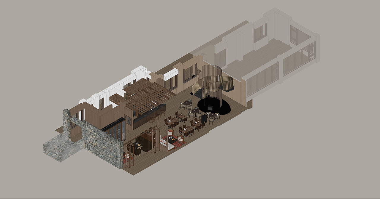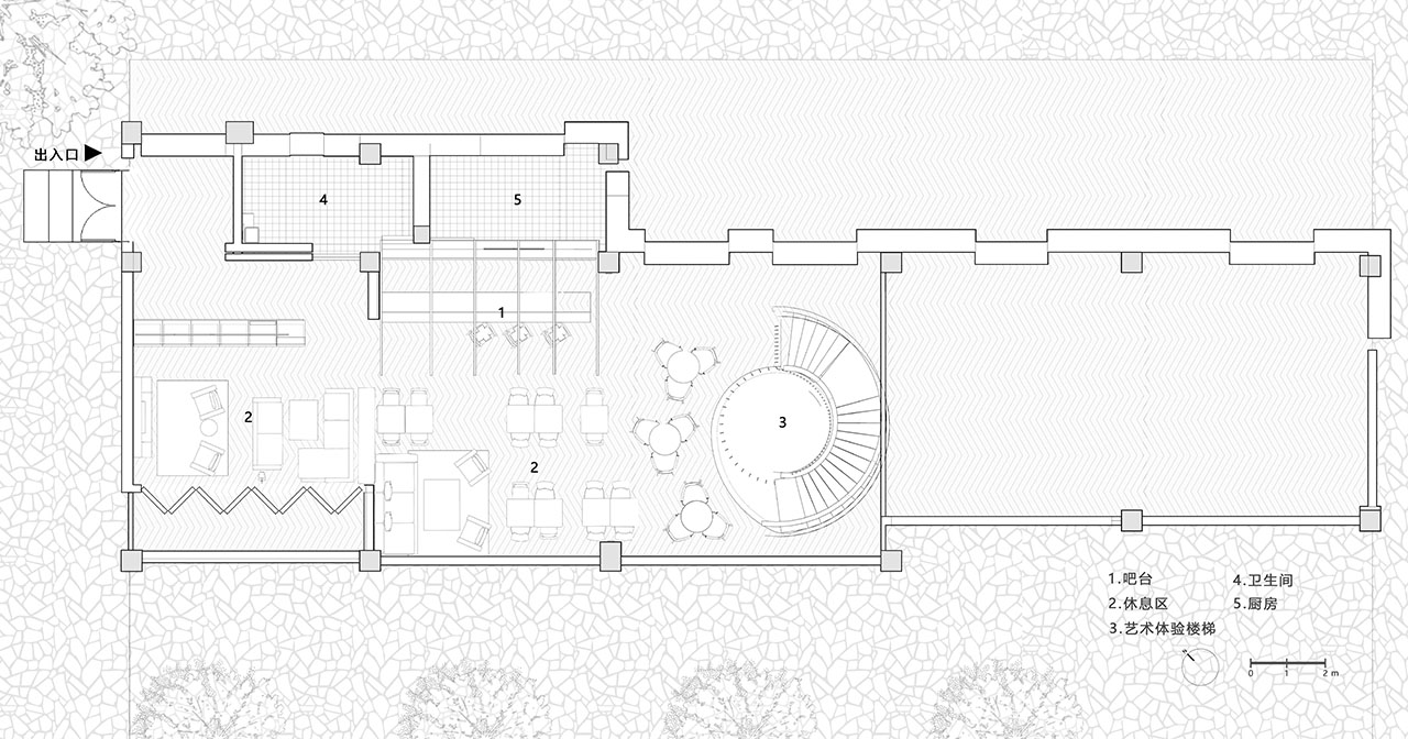 舞台背后的旋转楼梯通向三楼的观星阁既连接不同功能区域,又成为空间内极具艺术感的视觉符号。