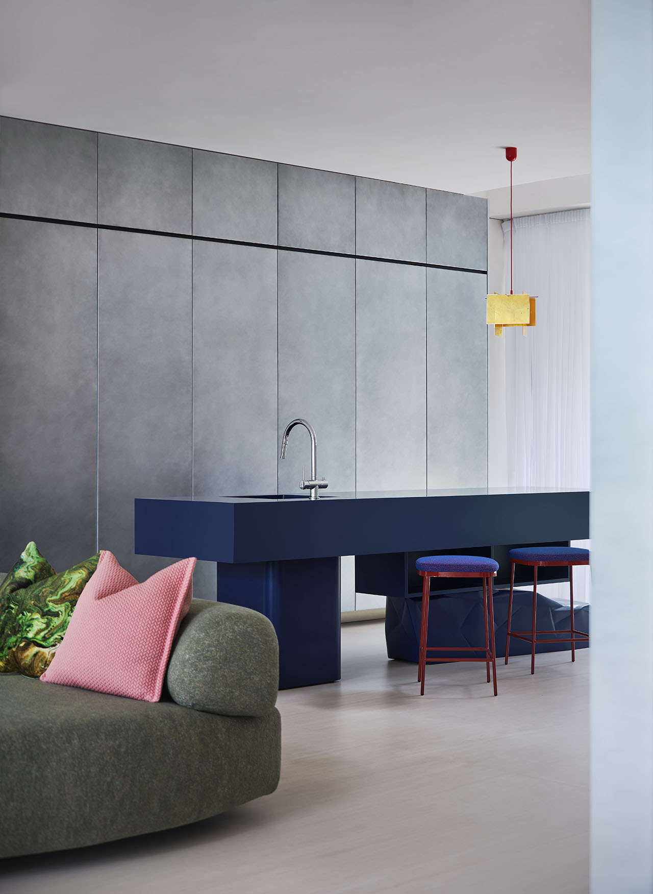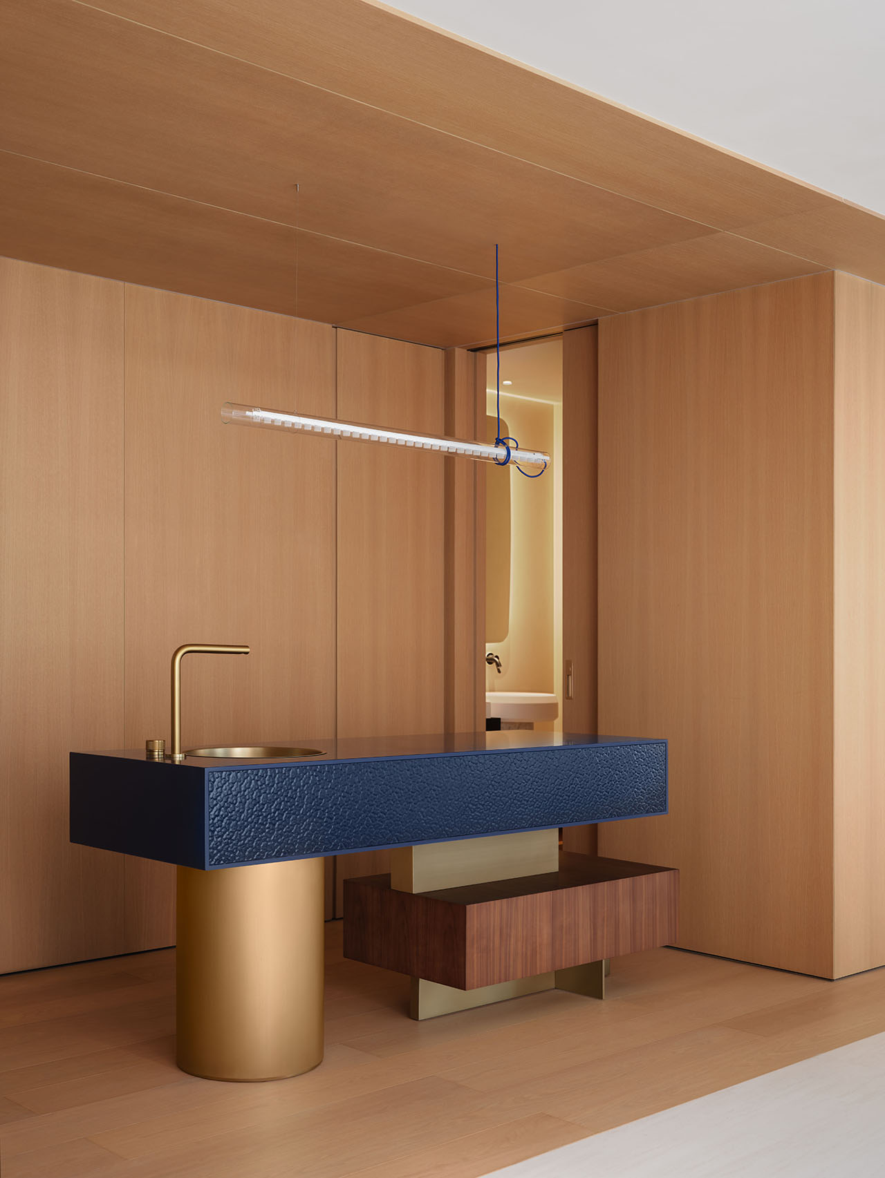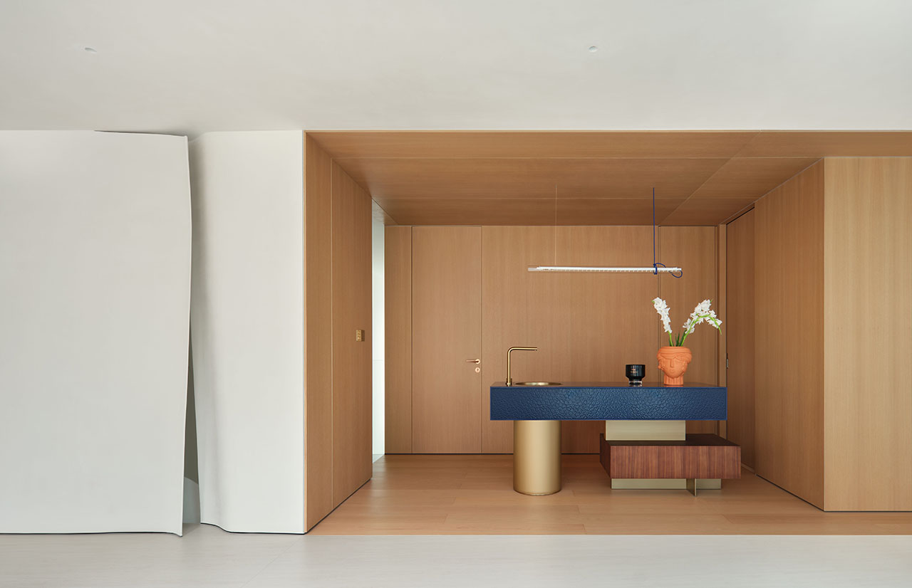 五层顶层的水吧区延续“破土而出”的生长概念,浅木饰面墙内嵌暗门(通往洗手间),衣柜与冰箱也一并整合入墙,让界面保持干净通透。深蓝肌理台面与金属细节为空间添了灵动亮点,在功能收纳的秩序中带出艺术感。