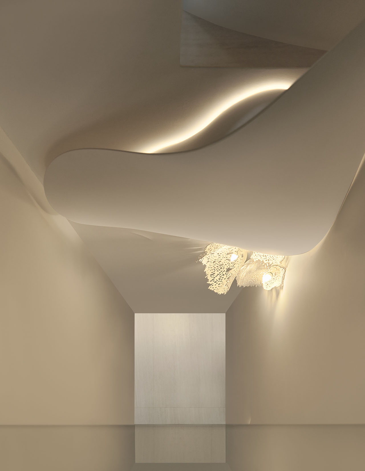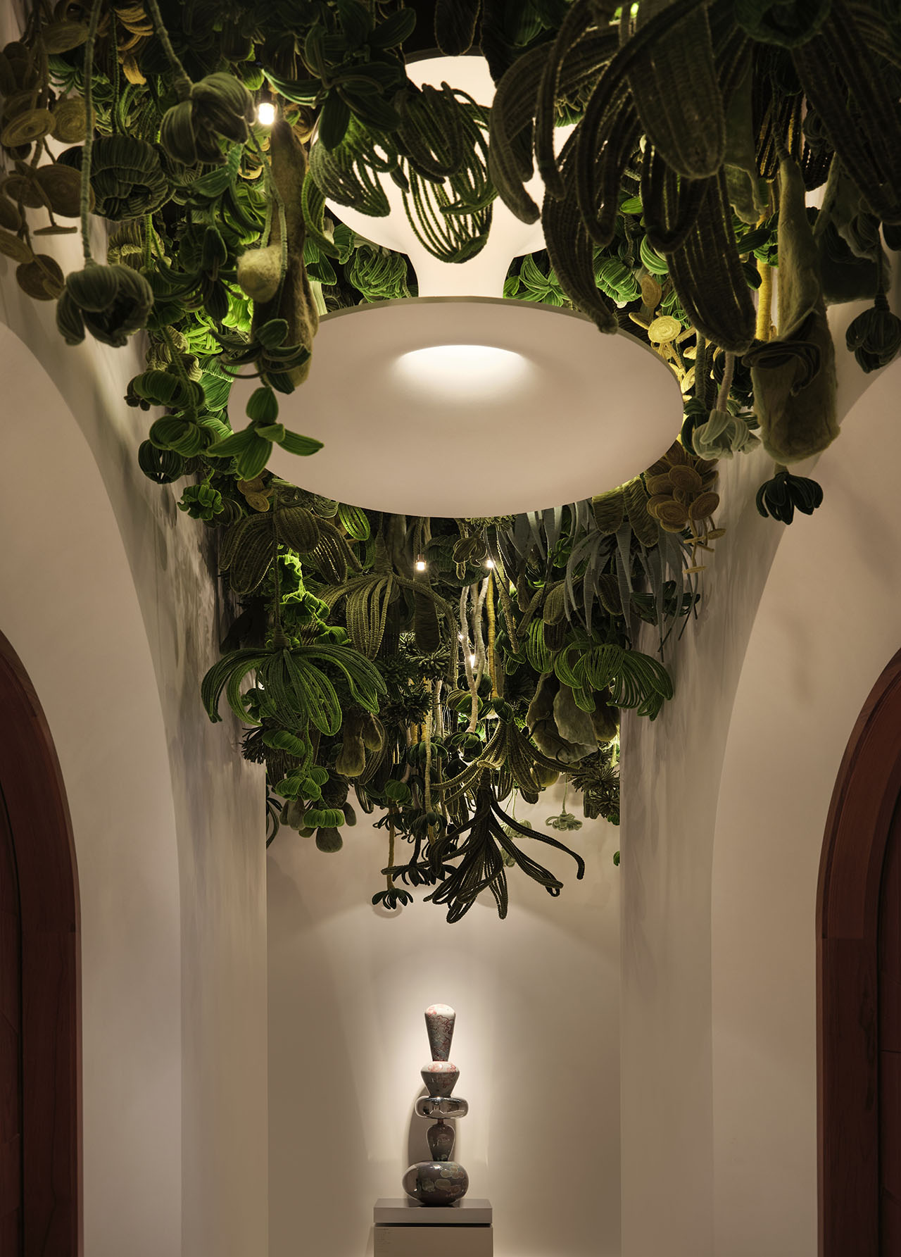 雕塑的曲线与上方“天花生长”的形态相互呼应,自然与艺术在入口对望推门而入,拱形门洞柔和收住节奏,木质与白墙的过渡带着克制的温度。真正抓住视线的是头顶——纤维仿生植被从天花“长”下来,与圆形顶灯交叠,光线沿着褶皱与枝蔓缓缓散开,让顶面成为生长的起点。