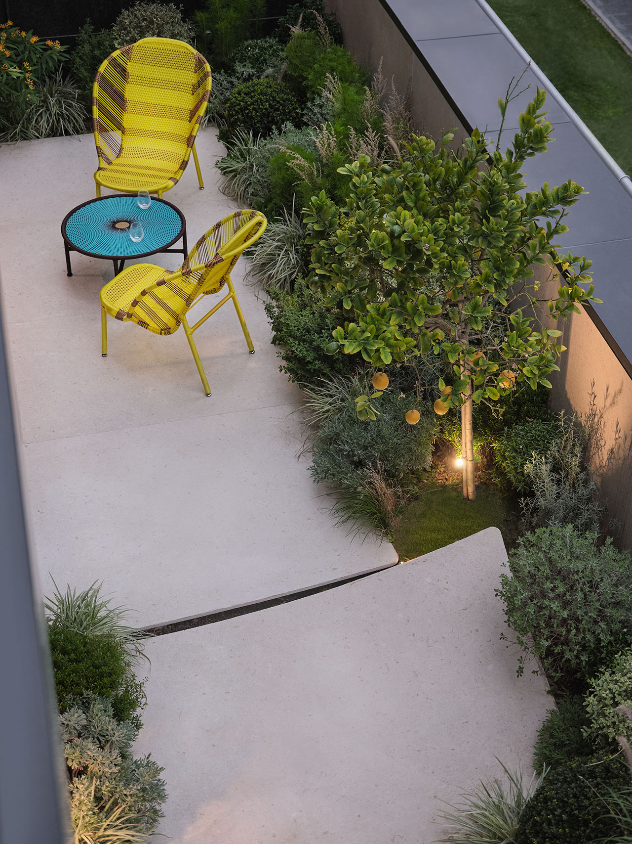 “生长花园”的户外区延续了破土意象:植被簇生、柠檬树舒展,地面石板以微翘形态呼应生长的张力。