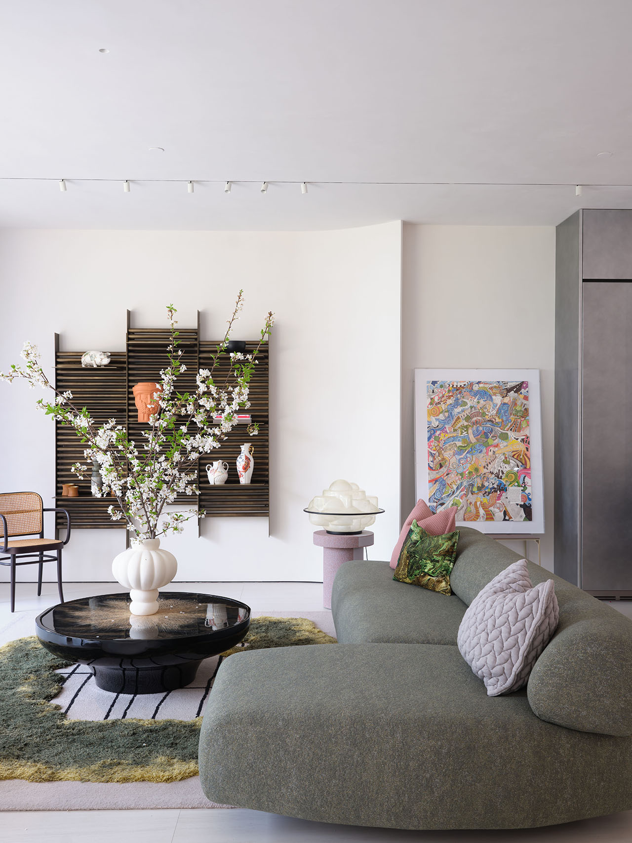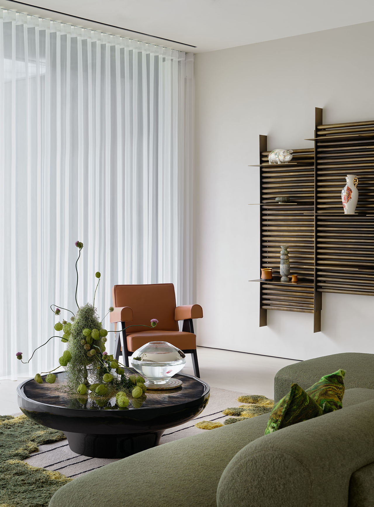 绿调沙发、自然质感地毯与花艺相互呼应,将“植物生长”的意象从挑空延伸到软装,空间在通透的呼吸感中呈现出艺术与自然的共生氛围。