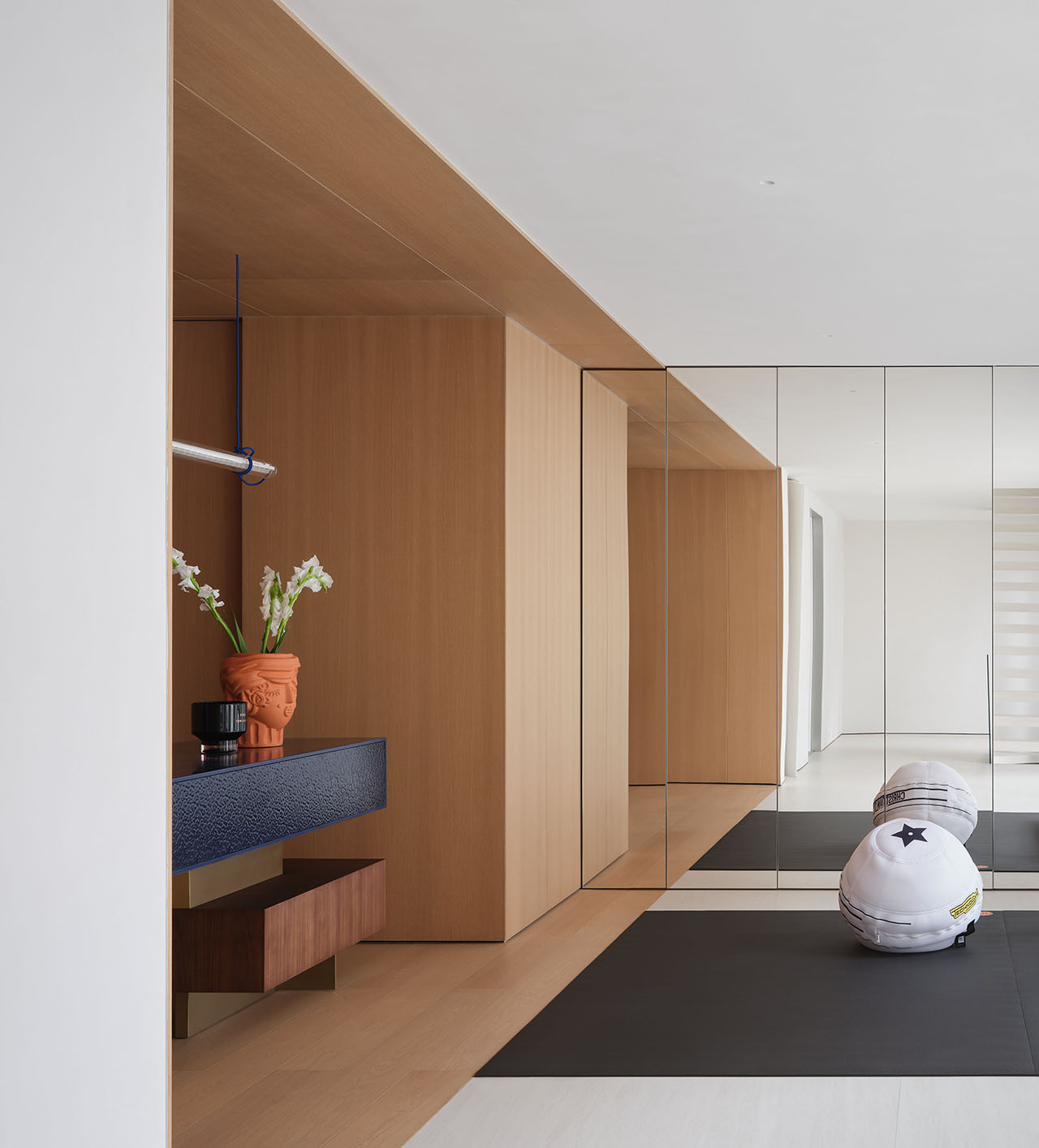 健身区与水吧相对而置,浅木墙整合储物、镜面兼具扩容与藏动线,让功能被收进干净的美学逻辑里,在简洁中延续空间的生长气息。