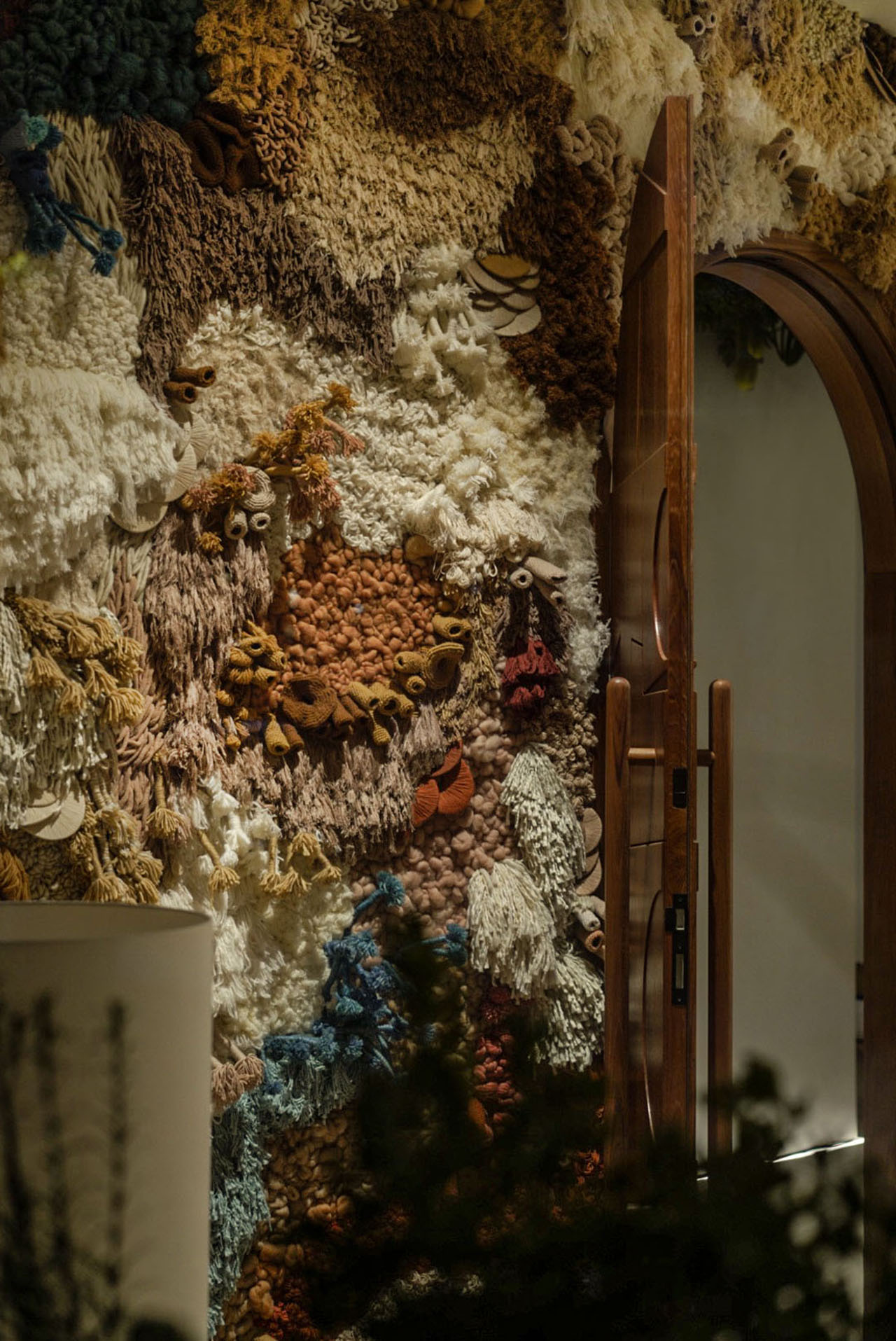 装置以不同绒感堆叠层次:浅米长绒勾勒海藻的柔软流动,深蓝短绒呈现珊瑚的簇状触感,棕调卷绒还原海草的蜷曲线条。墙面既像海底的自然生长,又以材质差异织出细腻的放松感。