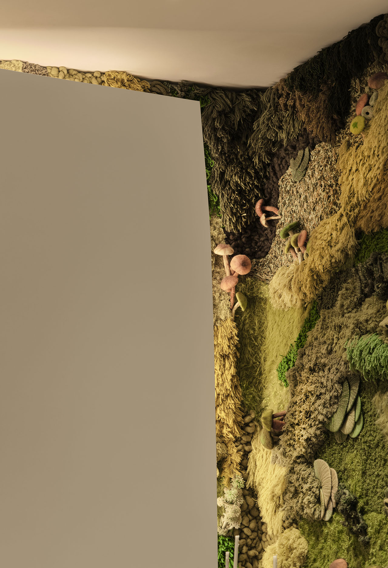 异开设计以长绒为基底,深浅不一的绿色沿墙面铺开,粉棕仿生菌菇恰好在弧度折角处“破土而出”。墙面仿佛被菌群的生长张力轻轻顶起,把“破土”意象融进弧度与肌理,让空间的生长感更直观、也更具象。