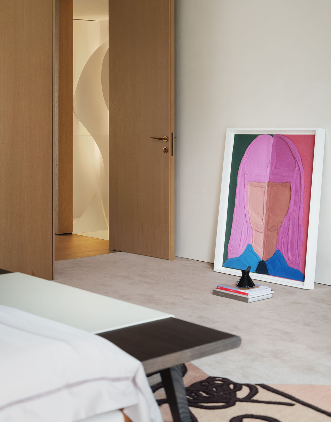 卧室以柔弧墙面延续“生长”的叙事,软包床头衬着低饱和软装,肌理地毯添了柔软松弛感。功能区隐入墙体,使空间保持极致简洁,让休憩氛围与整体的自然生长调性自然融在一起。
