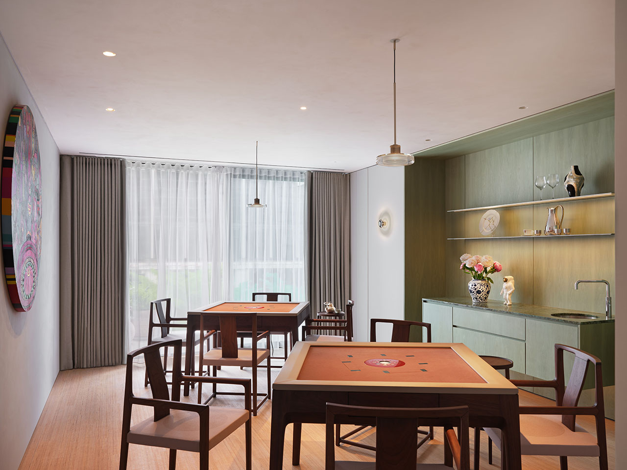 “生长花园”的棋牌室,以中式棋牌桌与木椅为核心,搭配草木色现代柜体,花艺与藏品点缀出雅致而松弛的氛围。