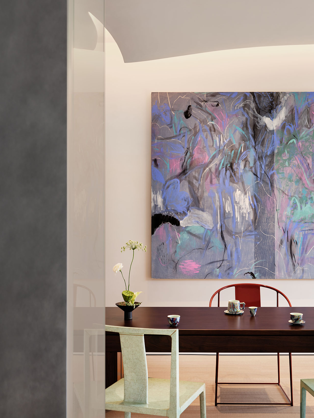 茶室内,弧形墙顶延续了向上的生长的生命力与张力,茶桌旁青绿花瓶与挂画呼应,软装带来松弛自然感,让茶室既承接空间的生长叙事,又增添静谧共生氛围。