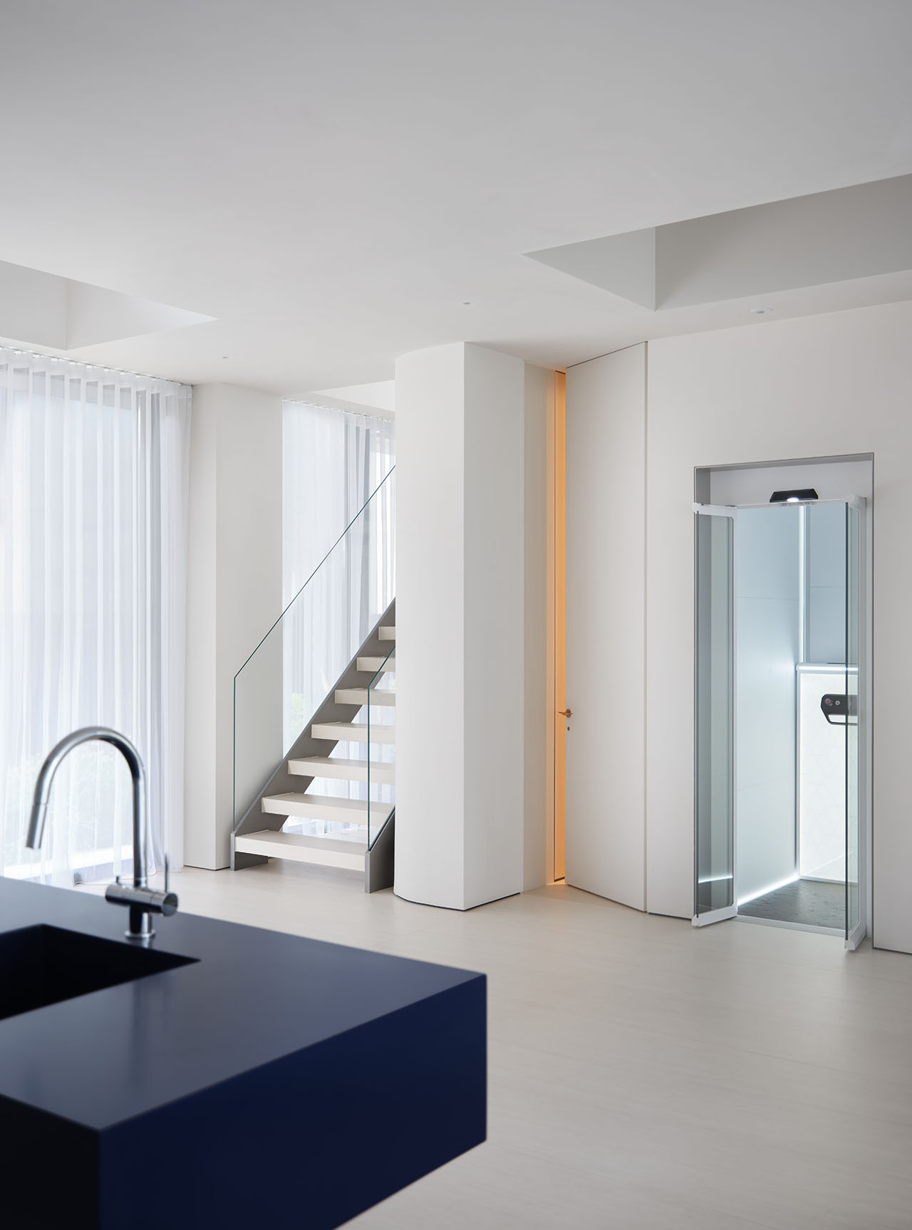 挑空不仅是结构动作,更像是在建筑内部挖出一条“呼吸轴线”。来自顶部的自然光顺着弧面与楼板层层落下,与玻璃折射形成光的结构语言。
