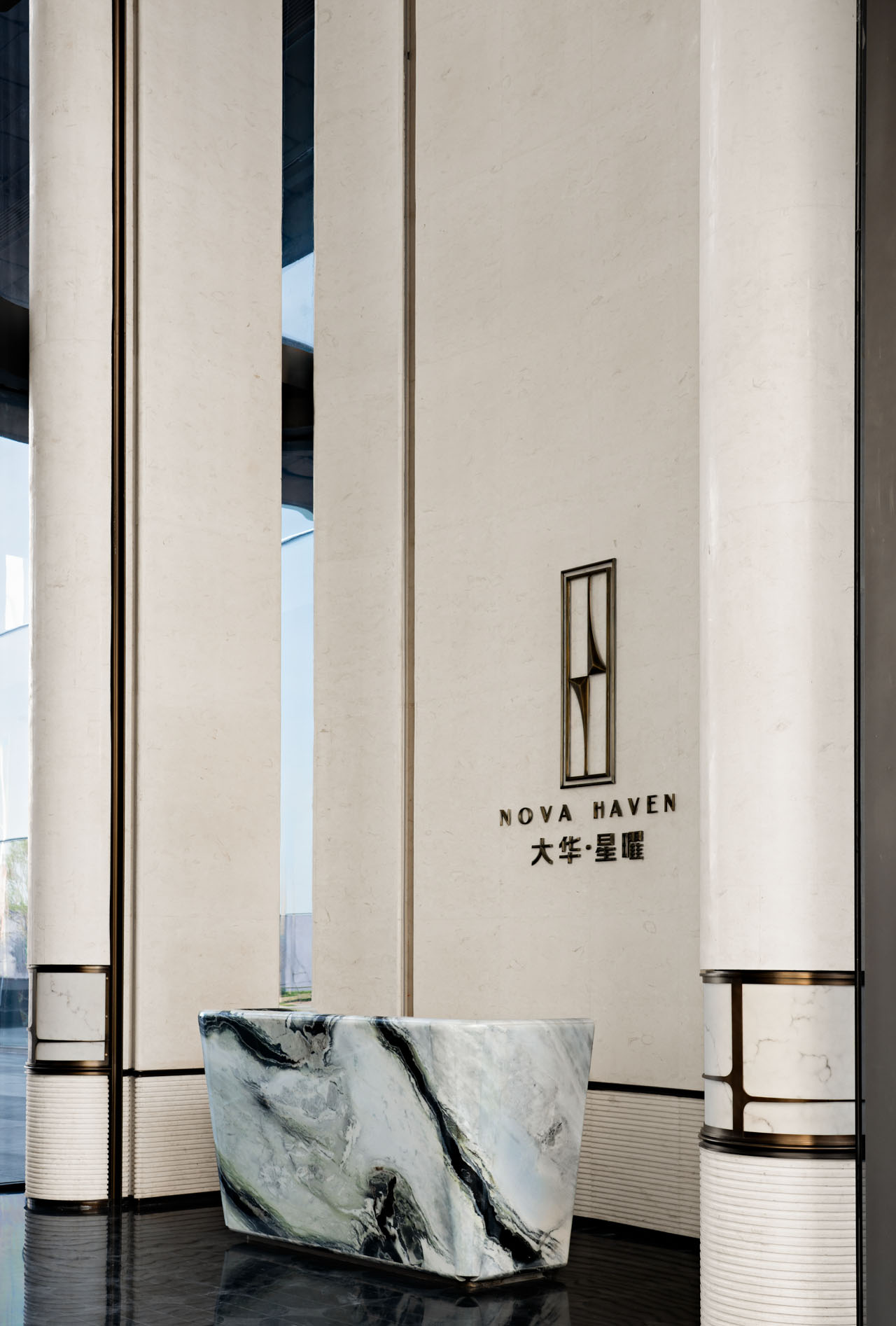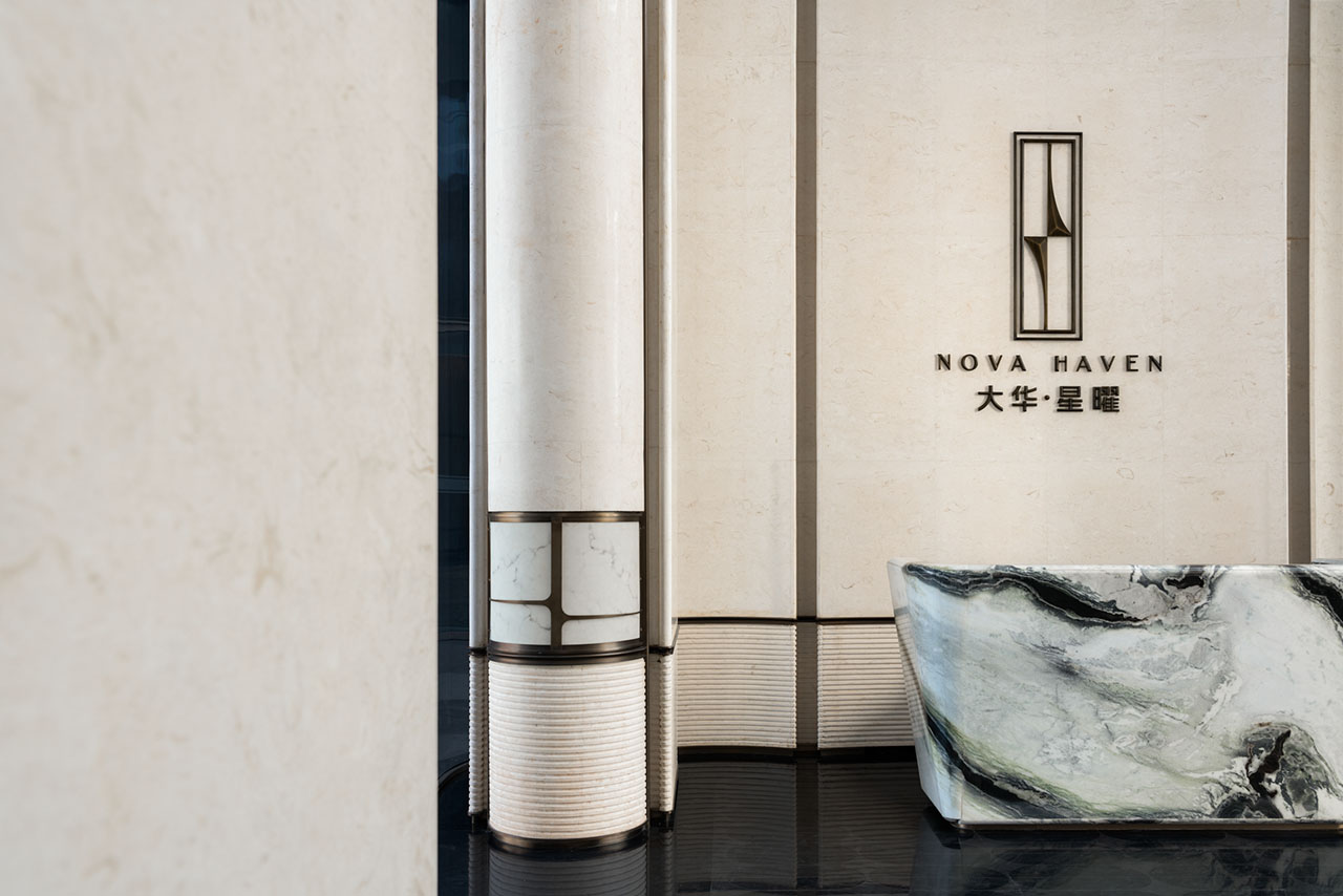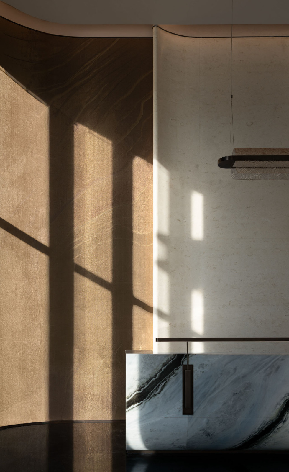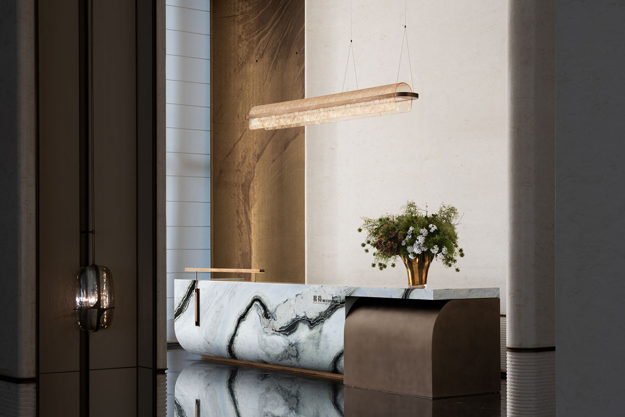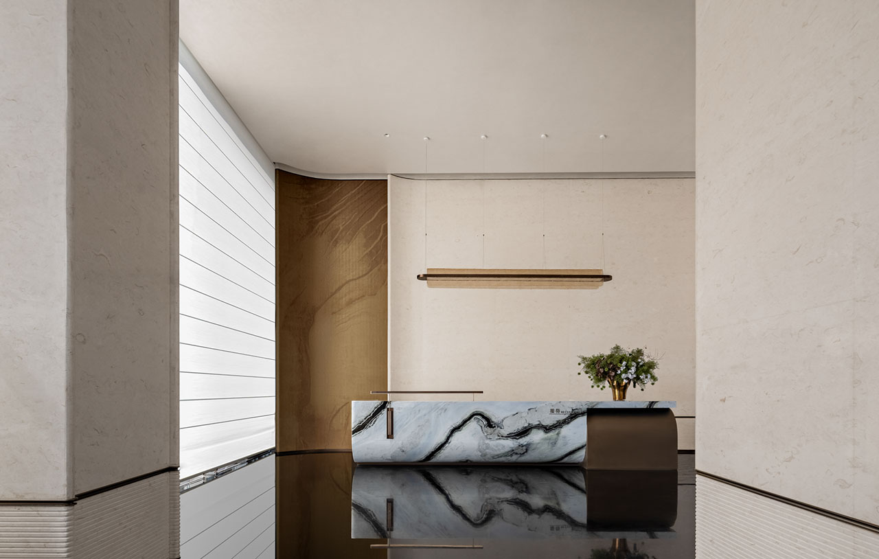 接待区的核心形象来自礁石。弧形前台带有稳定而安静的体量感,如同临海而立的岩体。整块熊猫白大理石经过整体塑造,表面嵌入的金属凹槽不再直接再现波浪,而是以更抽象的方式回应海水冲刷后的痕迹。相邻的金属壁布与石材背景彼此衔接,让粗粝感、光泽感与秩序感在同一界面中完成过渡。