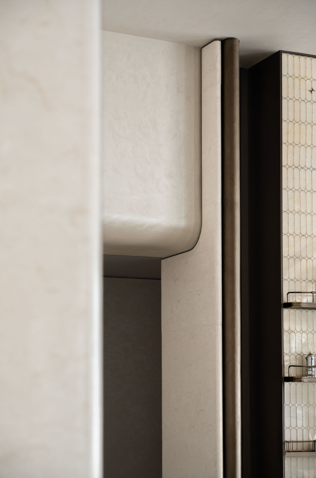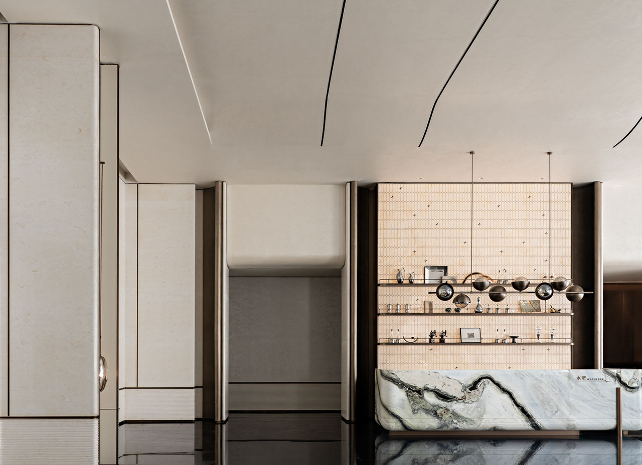 吧台台面采用猫白大理石,并以更具构成感的切割方式与金属层板形成对应关系。几何秩序、使用功能与材料表现被压缩在同一装置里,让这一部分既承担服务属性,也具备明确的视觉记忆点。