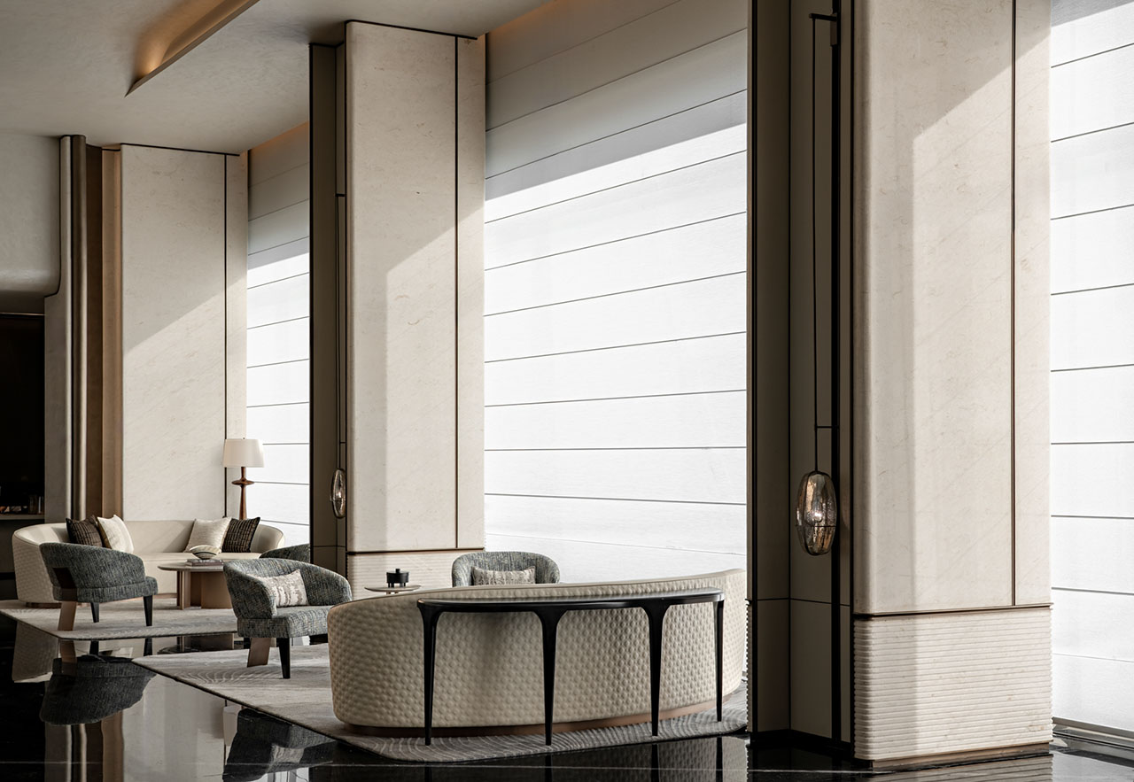 进入前厅,最先被感知到的是一种被放缓了的空间情绪。大面积米色石材覆盖墙面,表面温润而克制,带着近似海岸晨光的柔和质感;一侧金属壁布通过细微的明暗变化形成层层递进的反光,像海面在光线下轻微起伏。设计并未借助繁复装饰制造印象,而是让材料本身去完成氛围的建立,使空间的第一层感受自然落在“海天相接”的联想之上。