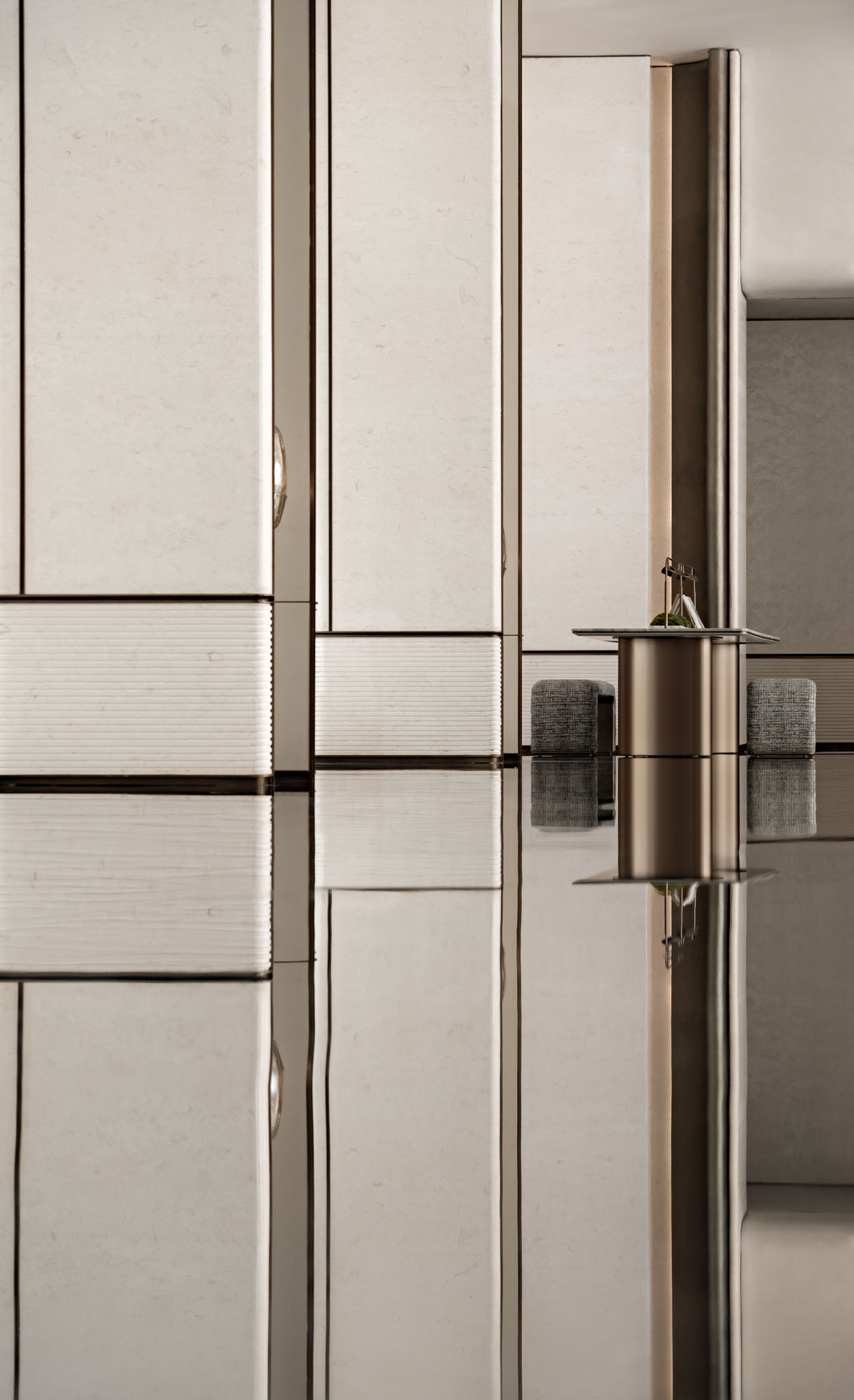 材质之间的深浅对照,也是塑造层次的重要方式。浅米色肌理与深色材质被有节奏地并置,形成近似潮汐涨落般的视觉变化。镜面地面的运用则让真实场景与反射影像叠合在一起,进一步放大空间的纵深感,也让整体氛围更具包裹性。