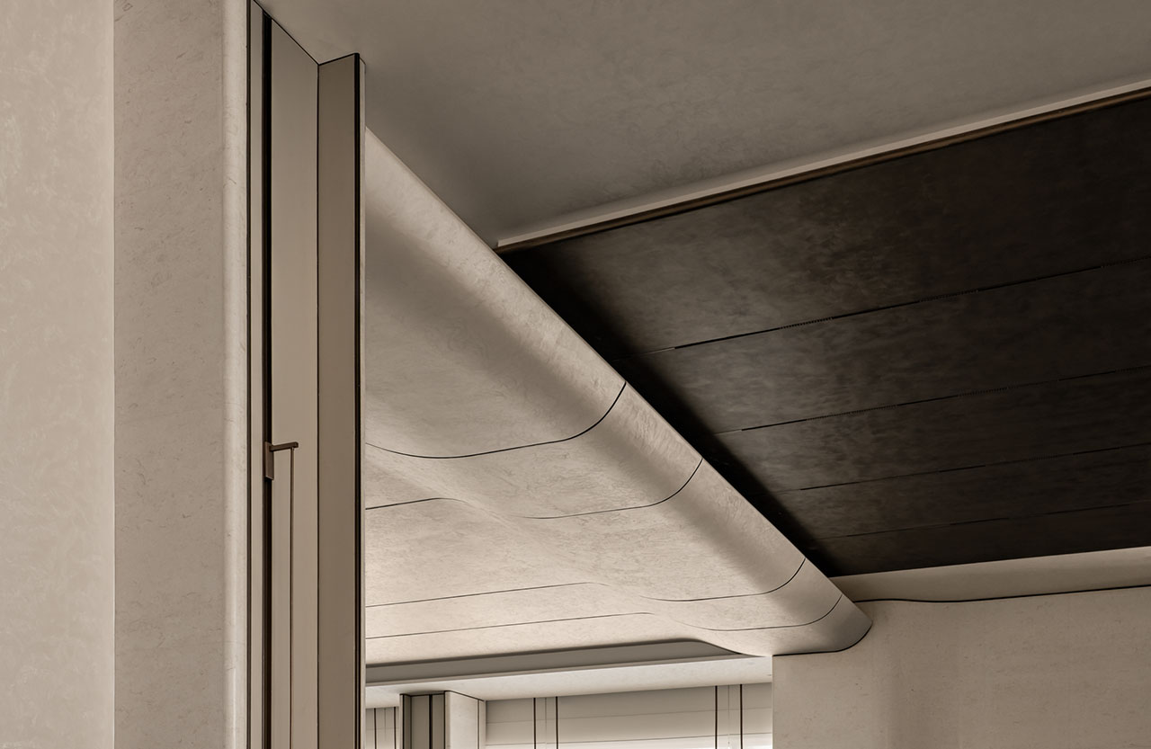 从整体方法来看,本案始终围绕“由自然入形、以虚实成境”推进。顶面与墙面通过连续曲面被柔和地连接起来,弧线像被拉长的潮汐轨迹,弱化了原有建筑边界的生硬感;与此同时,空间之间保留适度的可见与可达,使局部不再孤立,而是被纳入更完整的场域逻辑之中。