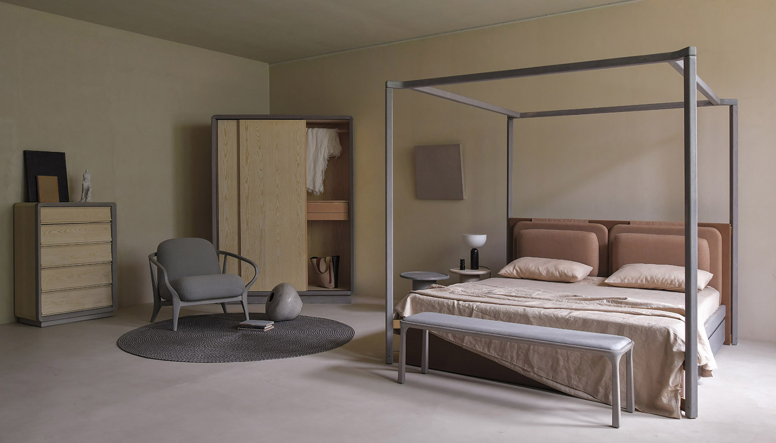 材质运用之外,梵几对木色也有着极致追求。为了呈现一种更为生动的黑,设计团队历时两年时间试验,通过化学反应让木头的纹理打开,自身产生颜色变化,再使用透明感木蜡油加以调和,两层颜色、数遍打磨、加长工艺周期打造出两款全新木色——新骏马黑与考拉灰。对梵几来说,黑有50种甚至更多,色偏、质地、光亮度、透明程度都赋予了颜色相异性格,而梵几对家具呈现的精准把握恰恰体现在这微妙的分毫之间。