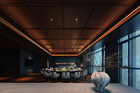 公共餐区的另一侧,设计师采用了宣纸裱糊的屏风墙将杂乱的采光和斑驳的墙面阻挡在就餐空间以外。宣纸略微毛糙的表面柔和了光与影,如同一层面纱带出了场所儒雅的气质。为了将入口处的“竹林”概念从室外引入室内,设计师在门外以及前后厅处树立了许多高外不一的黑色穿孔金属管,并将灯源置于管内,以模拟出竹子的形态。当夜幕降临,灯光从金属管的孔洞中渗出,就仿佛夏夜竹林里的萤火虫在闪烁,模糊了城市乡野的界限,也带出了对自然的向往。