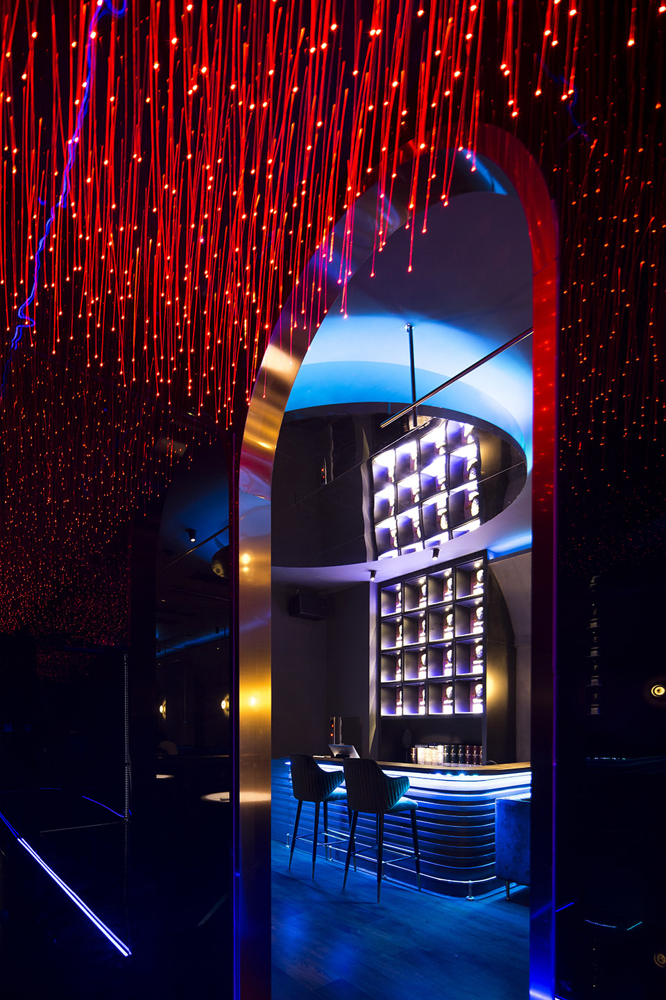 整个设计中都是用了变色灯带,单个是可以变换256种颜色,每个部分又可以分开调色。所以整个酒吧可以根据不同主题自由调控,变化无穷。他可以是充满未来感的,可以是充满热情的,可以是复古情调的,可以是精致高级的。 其中主导的是由红蓝两色。热情与冷漠,男性与女性,畅享冰与火之歌。