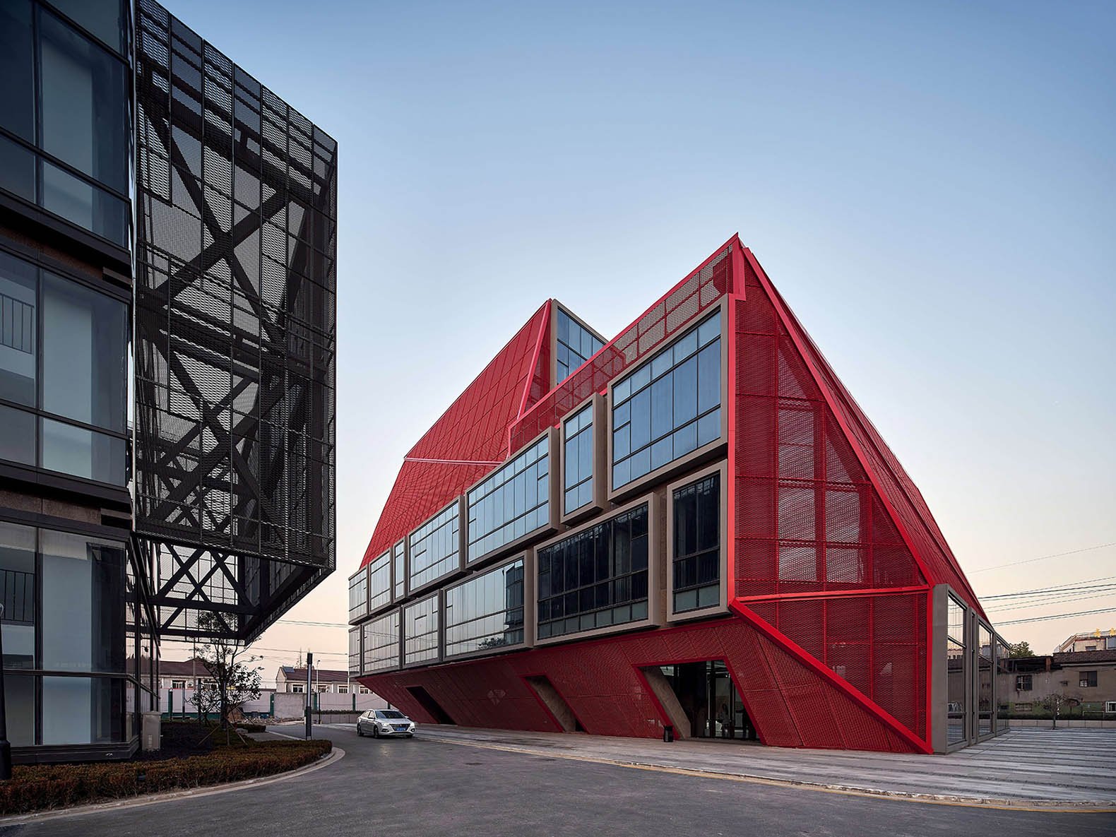 三层挑空空间南侧和东侧由折面复合幕墙围合,几组斜向巨型混凝土结构支撑起折面的钢结构,钢结构外侧色玻璃幕墙龙骨、玻璃和最外侧的红色拉伸网板幕墙。它们形成丰富叠加的层,由视觉的刺激转化为有组织的肌理。这些有组织的层和肌理在强烈的阳关下形成投射在地面和结构上移动的“光痕”,丰富了人对空间的体验和知觉感受具有现象学的特性。2号楼个体的塑造与群体相互牵制关联,而所展现的张力又将集群推向更独特的状态,它们产生的影响力渗透进城市脉络之中。